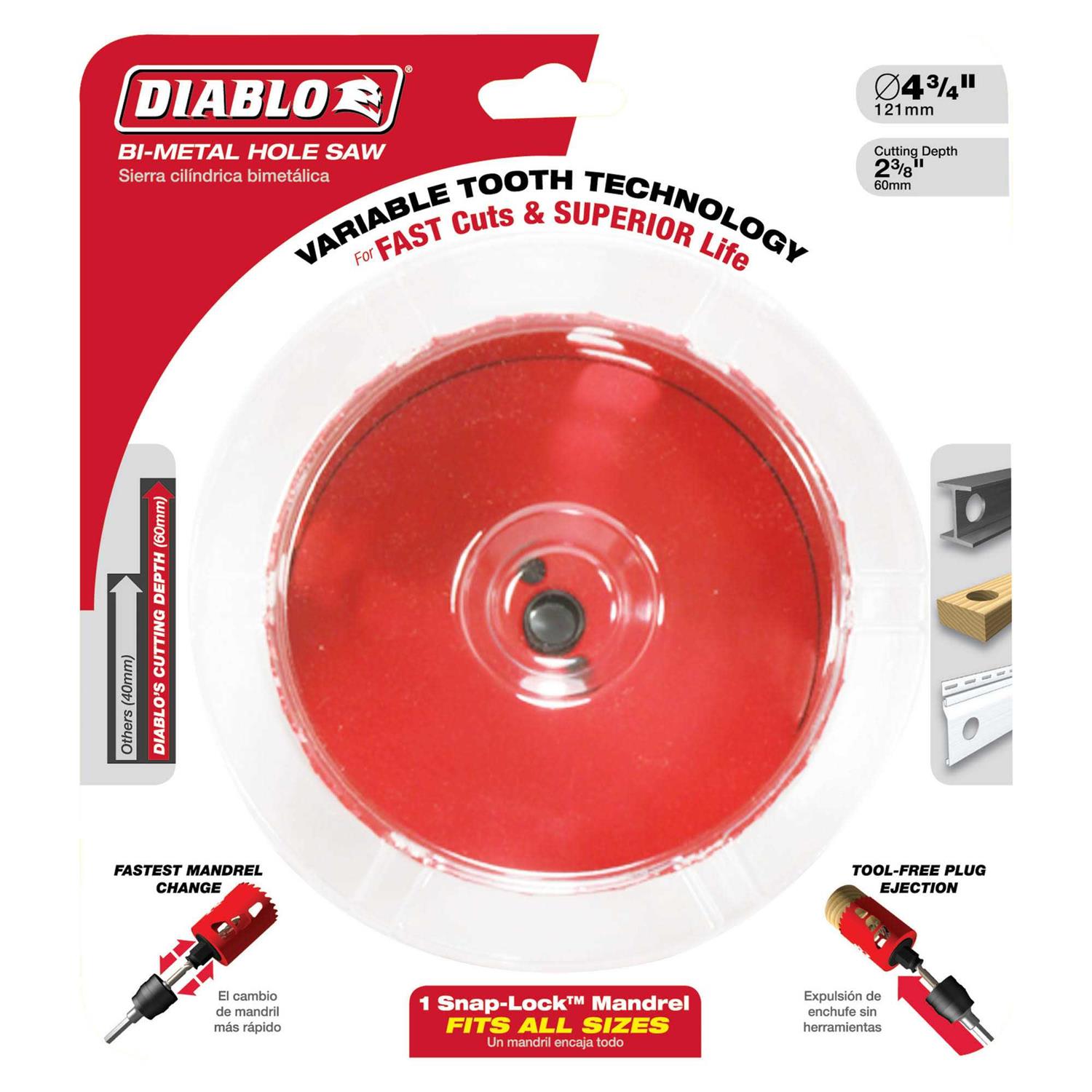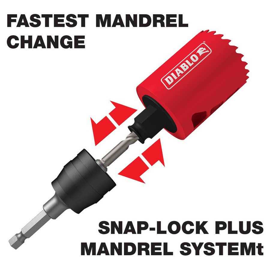 - One-size fits all Snap-Lock mandrel fits all Diablo hole saws from 5/8-inch to 6-inches in diameter