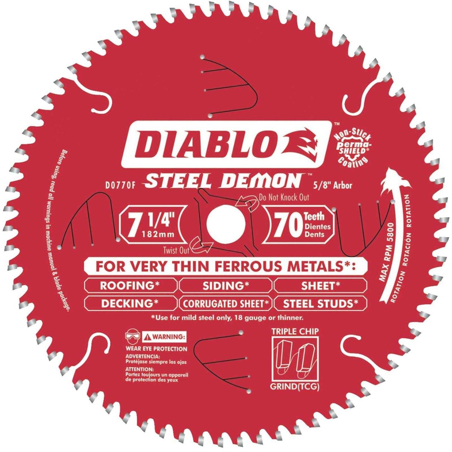 Steel Demon saw blades are specially designed for the extreme demands of ferrous metal cutting; thereby enabling precise cuts without sparks, heat or burred edges that result from using abrasive blades. With up to 40X the life of standard abrasive disc, Steel demon delivers unparalleled performance and superior quality cuts. Blades feature Freud’s TiCo Hi-Density Carbide, Laser cut bodies, Anti-vibration technology, Perma-Shield Non-Stick Coating, Triple Chip Design, and pretensioned blades. Diablo ‘s blade is designed to fit 7-1/4-Inch Circular Saws .