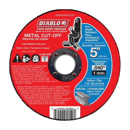 Diablo’s premium thin kerf metal cut-off discs deliver superior performance and increased productivity. Features a premium aluminum oxide blend that produces quick cuts and offers an extra-long cutting life. Unlike other bonded discs on the market, these discs feature a true 0.40 in. design. The thin kerf design provides for a thin cut, allowing your power tool to work at its full potential. Designed to be backwards compatible, these discs work with X-Lock and 7/8 in. arbor angle grinders when cutting metal and stainless steel.