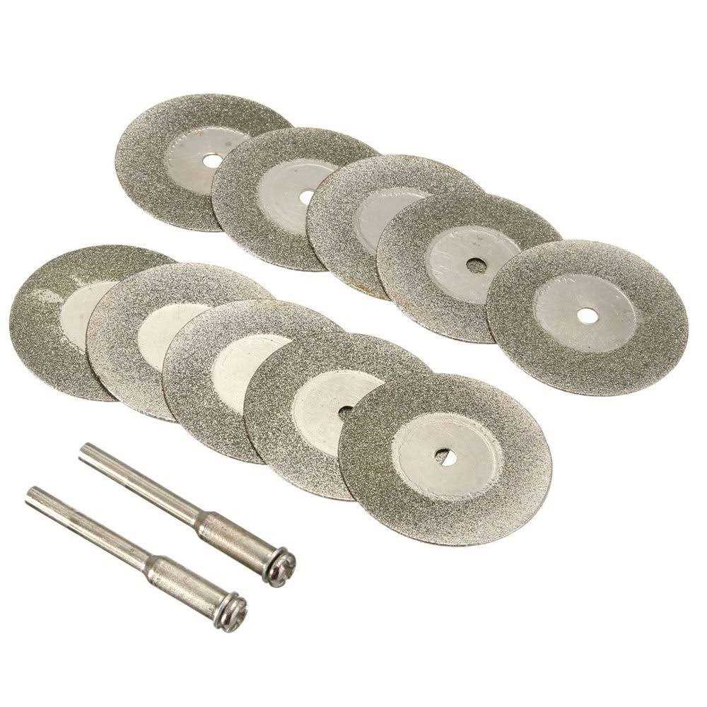 Compatible with Dremel, Wen ect. Rotary Tools . Turn your rotary tool into high-speed cut-off saw & grinding machine. The Cutting Wheels are sharp and strong, making them perfect for Cutting gemstones, glass, geramics, porcelain, tiles, carbide, rocks, aluminium and copper Suitable for most rotary and air tools. Cutting discs diameter: 22mm; Mandrel Diameter:3.0mm. /br Material: Carbon steel br Disc Diameter: Approx. 0.87inch/22mm /br Disc Thickness: Approx. 0.02inch/0.60mm br Shaft Length: Approx. 1.42inch/36mm /br Shaft Diameter at Top: Approx. 0.18inch/4.5mm br Shaft Diameter at Bottom: Approx. 0.12inch/3mm /br Coating: Dual sided and edge br /br Package includes: br /br 10 x Diamond Cutting Disc br 2 x Mandrel