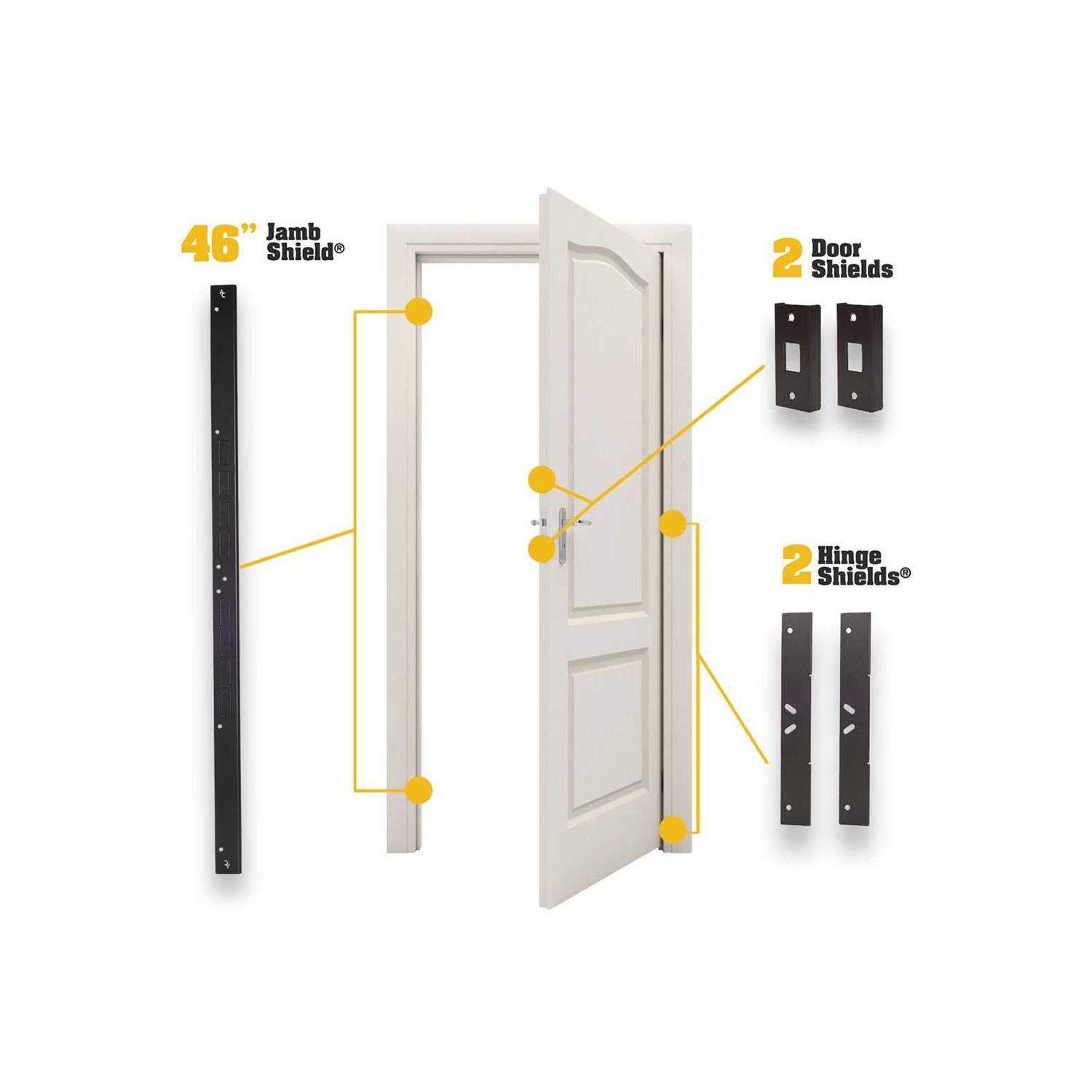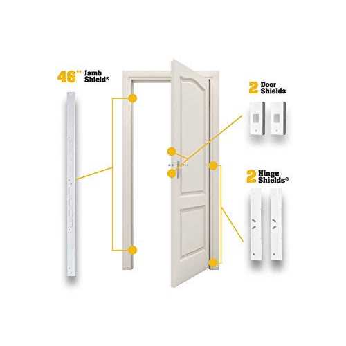 Set comes with jamb shield 2 hinge shields and 2 mini door shields. Jamb and hinge shields are L-shaped pieces that attach to the face of the door jamb and can be applied without removing the door or entirely removing the trim. 48.56 inches long and has holes cut to fit locks spaced from 4 to 21 inches apart 1-3/4 door thickness. Can also be used to repair the damage from an existing kick-in.