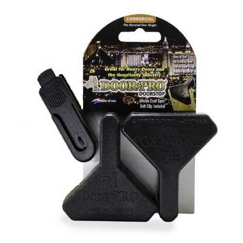 DoorPRO Doorstop w/clip (Hinge-based) Ideal for the professional only! Used as a temporary tool to prop open heavy doors. Open the door all the way placing the DoorPRO directly over the middle door hinge. Designed to fit on standard and spring-loaded hinges.