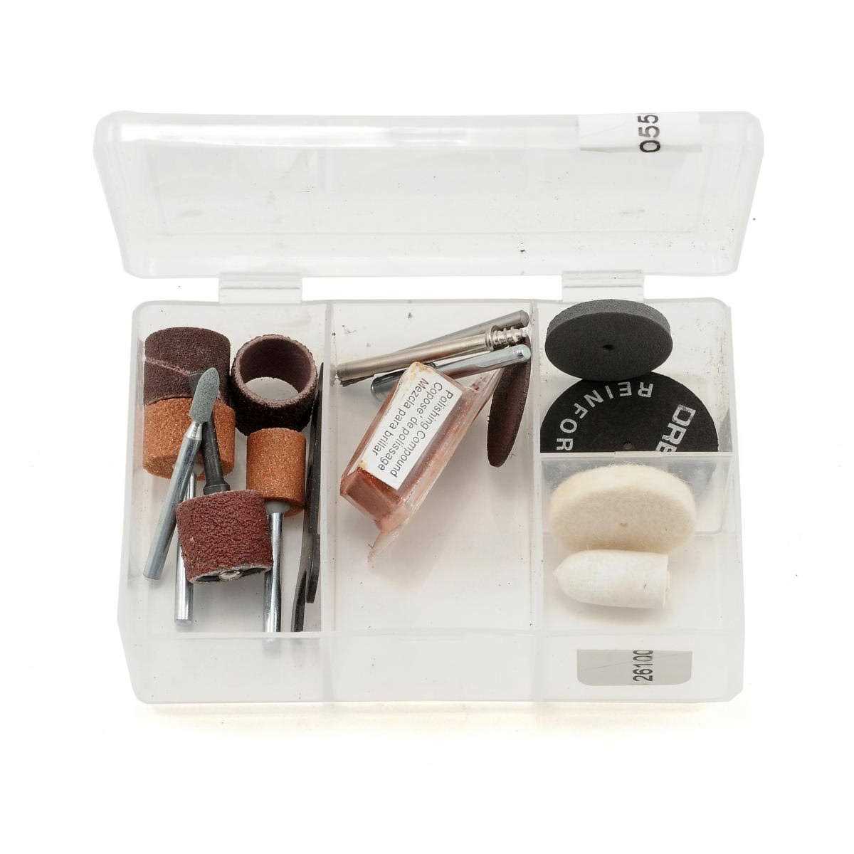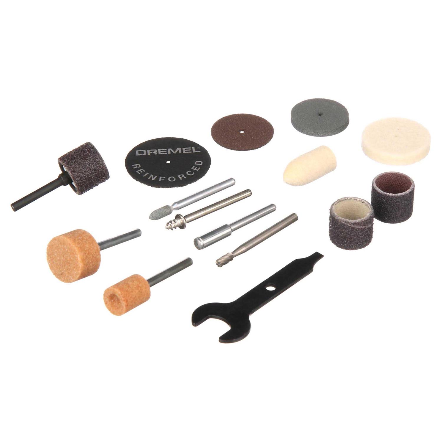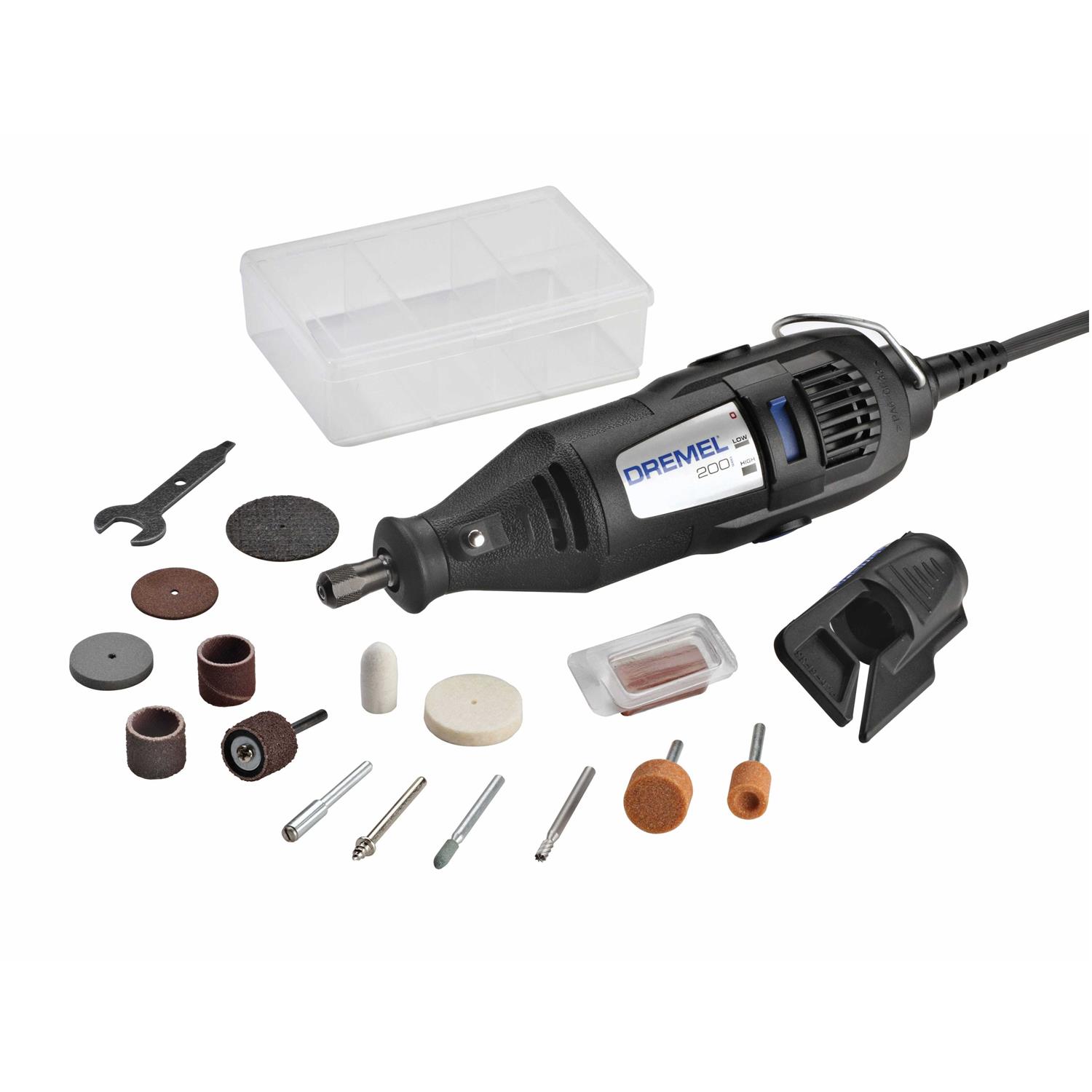 The Dremel 200 series rotary tool offers the precision and control required to complete a wide range of projects. Its two speed settings allow you to use the low speed setting for cleaning applications and using brush accessories and the high speed setting for routing, cutting and sanding applications. Two speed control allows you to set your speed at 15,000 or 35,000 RPM with a flip of a switch Click-and-set on/off switch allows precise speed selection Cool-running ball bearing construction for smooth and quiet operation Replaceable motor brushes extend tool life Lightweight design for comfort during prolonged use Ideal for multiple applications on a variety of materials Includes 15 accessories and 1 attachment. Included: Dremel 200 series rotary tool Lawn mower and garden tool sharpener #194 high speed cutter #401 mandrel #402 mandre # 407 coarse 1/2 sanding drum #408 coarse 1/2 sanding band #420 heavy duty emery cut-off wheel #421 polishing compound #422 cone polishing tip #425 emery wheel #426 1-1/4 fiberglass-reinforced cut-off wheel #429 large felt wheel #432 1/2 120-grit sanding band #932 aluminum oxide grinding stone #8193 aluminum oxide grinding stone #83322 silicon carbide grinding stone.