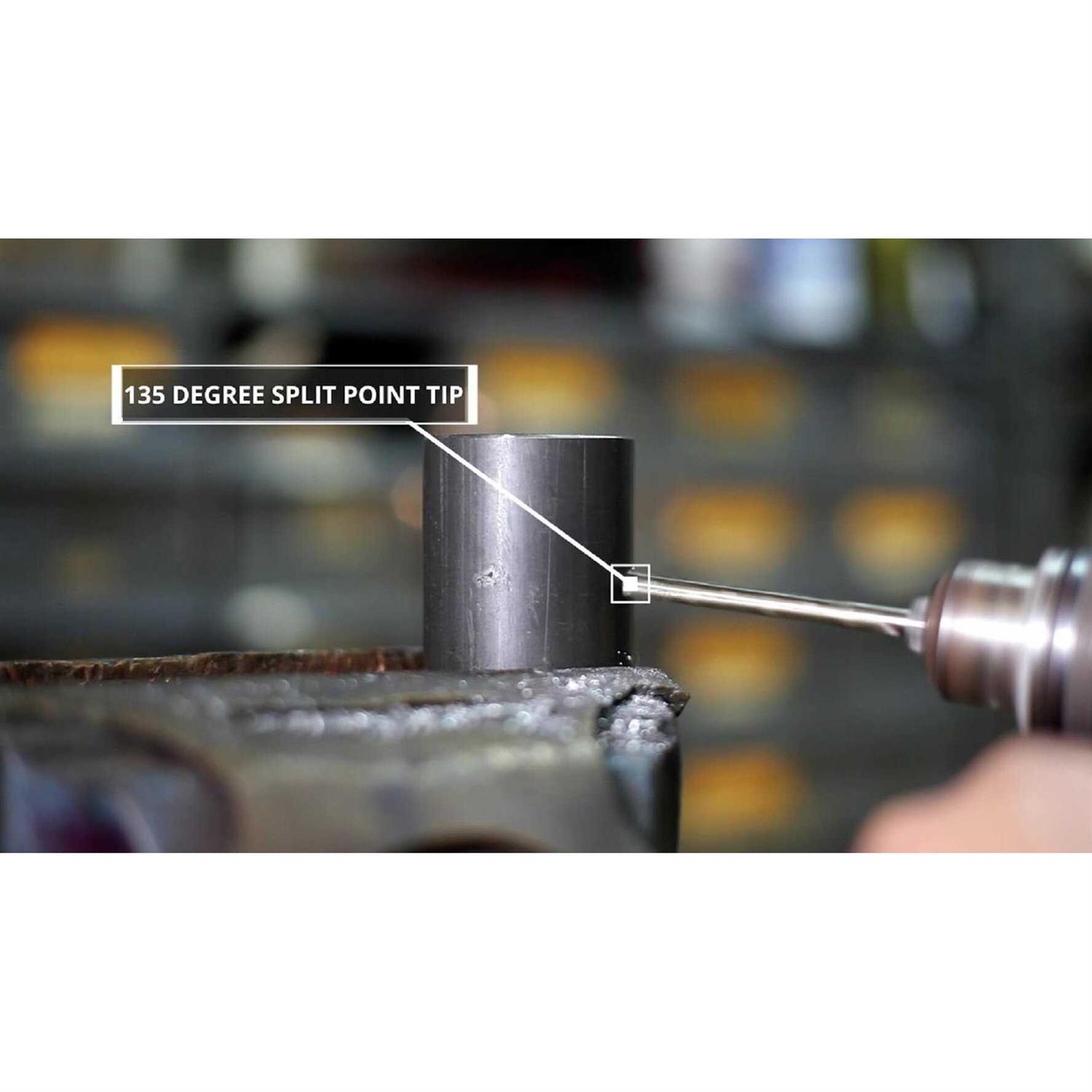 - Self-centering 135-degree split point penetrates hard material without a pilot hole and produces small chips to reduce clogging