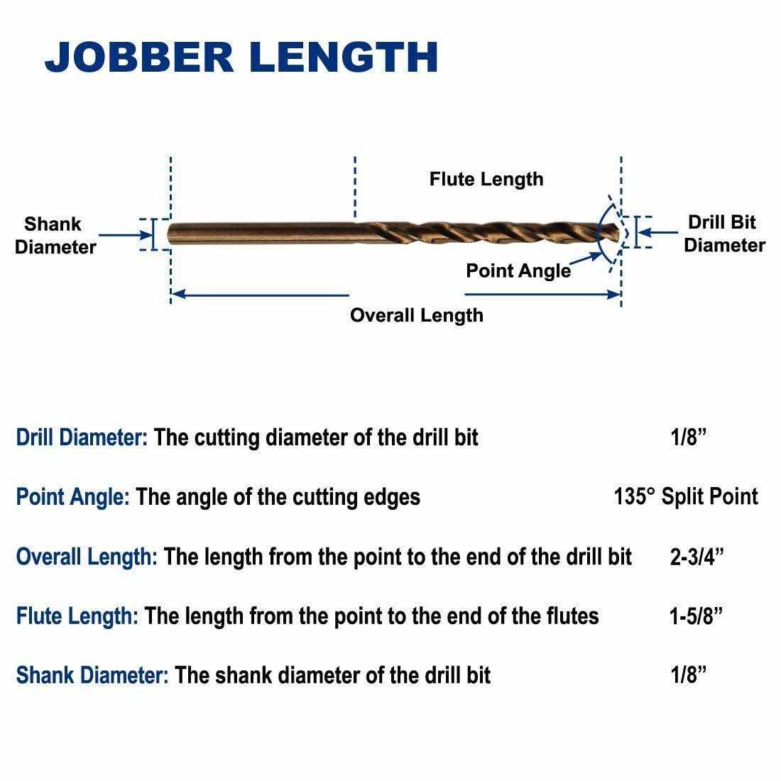 - JOBBER LENGTH: 1/8-inch cutting diameter, 1-5/8-inch flute length, 2-3/4-inch overall length, 135 degree split point, straight shank