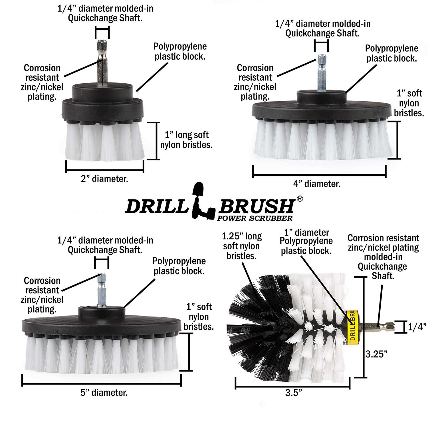 Four-piece cleaning and detailing kit includes 4 different size and shape automotive/boat wash and detail brushes. The white brushes have soft bristles for scratch-free cleaning and scrubbing. All brushes feature rugged steel shafts with a (quarter inch) quick-change attachment for fast change-out of components. Clean and scrub aluminum, magnesium, chrome, clear coated, and painted rims and wheels for cars, trucks, and motorcycles. Use the power of your cordless drill to clean and scrub (drill not included). This car/boat cleaning kit includes the Drillbrush Original Power Scrubber corner and contour brush in soft white. Use this classic brush to clean car and motorcycle wheels, RVs, Boats, Jet Skis, Jeeps and off-road vehicles. Interior grime, stains and spills are no match for the rotary scrubbing action of The Original Drillbrush Power Scrubber. Included in the kit is a 5 In. flat round brush. Tackle large areas like Tonneau covers, large area carpets, or boat hulls quickly with this larger brush. The 4 In. flat brush is also handy for bigger areas. Do you need to get into tight spaces or hard-to-reach areas – included is a 2 In. diameter brush for all of those hard-to-reach spots like around lug nuts, in between mag wheel spokes, or narrow areas of carpeting.