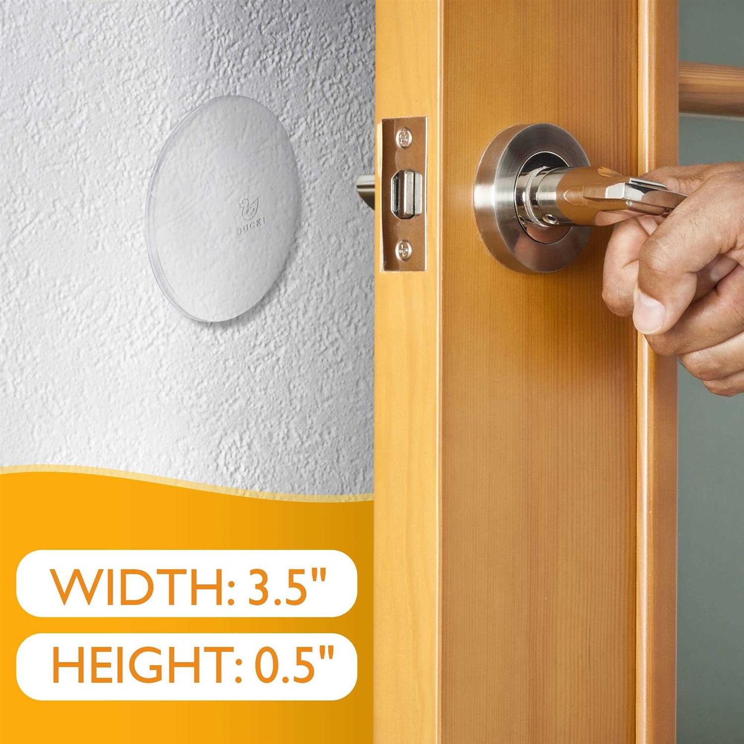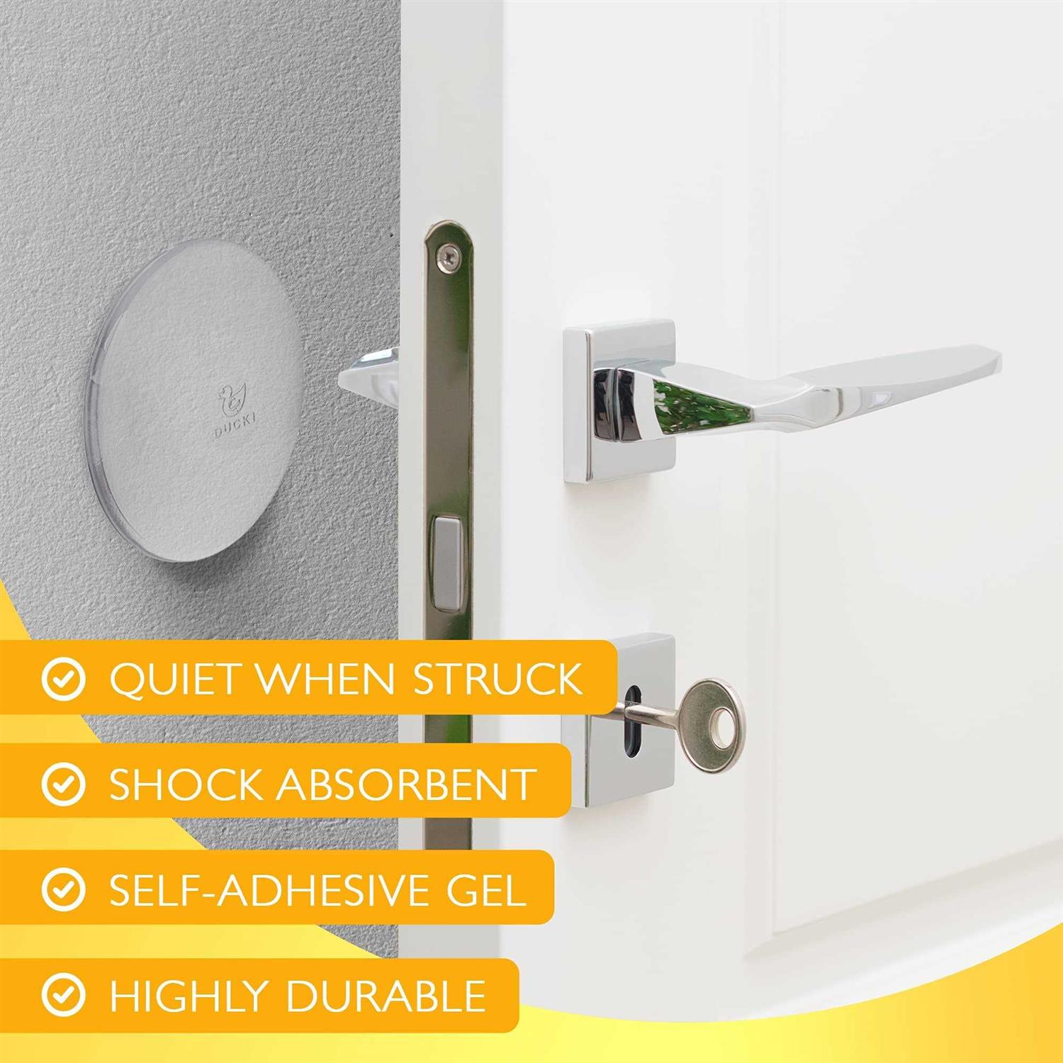 Ducki Reusable Wall Protector – Large Self Adhesive, Quiet, Shock Absorbent Gel -Premium Door Stopper for The Home or Office – Elegant Door Handle Silencer and Wall Protection Solution- (2pk)(Clear) Product Features DISCREET & DURABLE DOOR STOPPER TO PROTECT YOUR WALL – Forget door knobs damaging your walls and the noise of your doors slamming and banging! SHOCK ABSORBENT& SUPER QUIET – The innovative clear gel material is highly shock absorbent, so when your door handle hits the stopper it will absorb the sound as well as the impact. They are so durable, they will never crack or break, so you can protect your walls for years to come. REUSABLE WITH ZERO DAMAGE TO YOUR WALL – Each wall bumper protector is washable and reusable on any clean surface, offering unbeatable value when it comes to utility and home protection. They won’t leave any damage or marks on your wall, so you can be confident in placing them anywhere a door presents a problem. EASY TO INSTALL – The self-adhesive design makes these door knob wall shields super easy to put in place. Simply remove the peel and stick the gel silencer stops on the wall where your door handle would usually make contact. They’re also great for protecting your walls from your refrigerator, cabinet or shower doors!