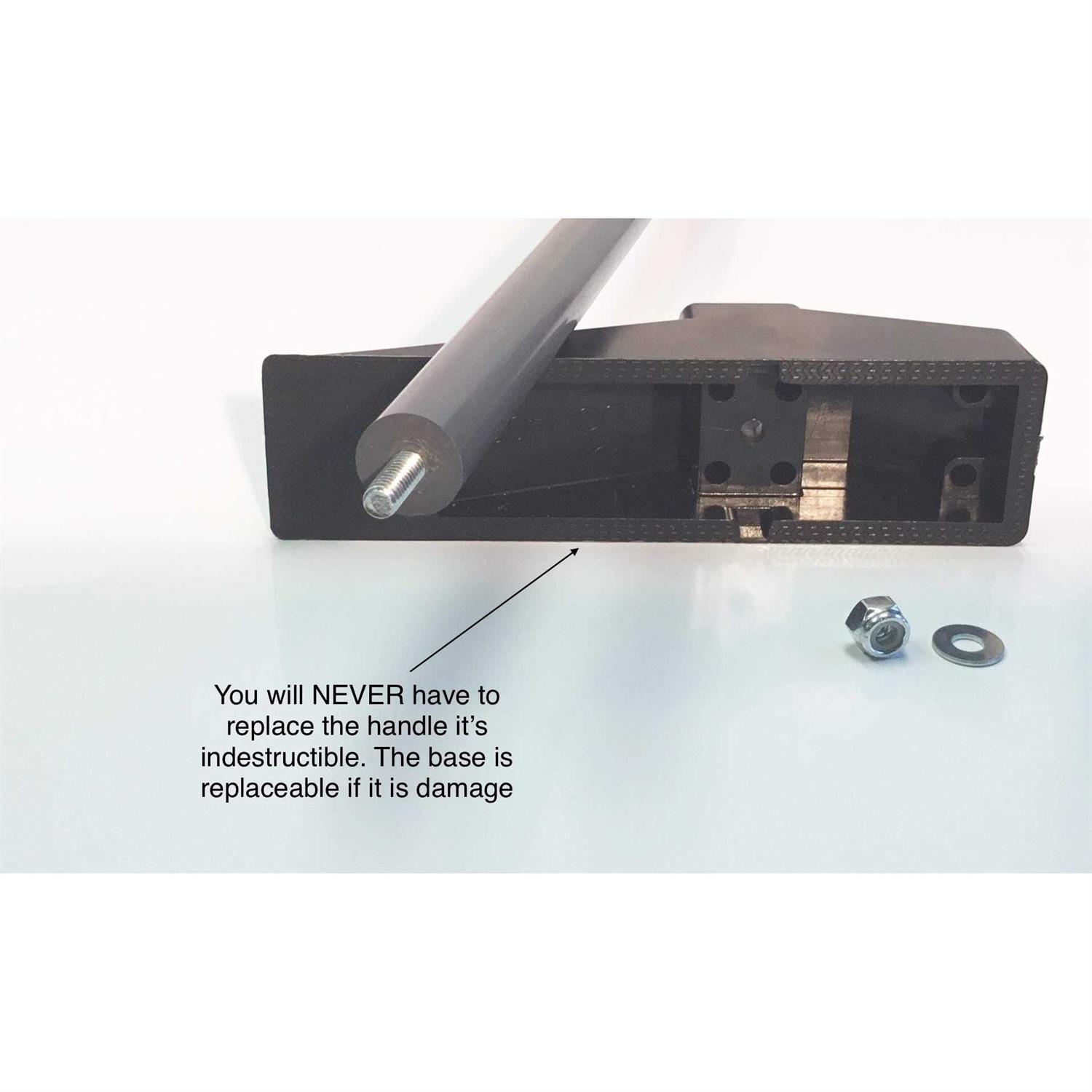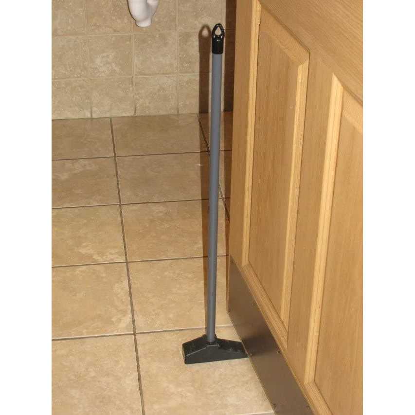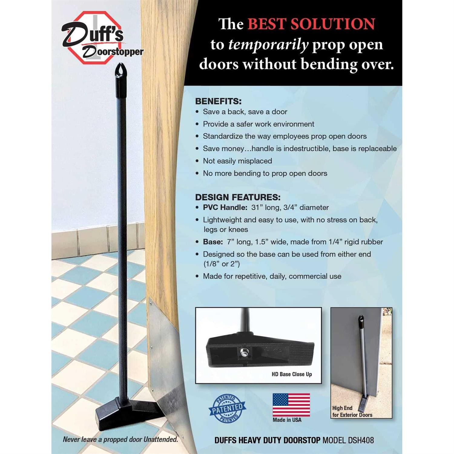 The Duff’s Heavy Duty is our best commercial doorstop. The handle is built to be indestructible, made of PVC; 1 diameter 28″ long. The red rubber base is 7″ long, 1 3/4″ wide, low side 1/8″ to high side 2″. The handle is inserted into the base with 1 pan-head screw. The Heavy Duty doorstop is lightweight, durable, easy to use and not easily misplaced. The doorstop is balanced to stand up on its own and can be conveniently stored in the corner next to the door. This doorstop was built for heavy commercial building use. The handle should last forever if used as intended. The base is replaceable and will last for 3 to 5 years minimum. Note: If the doorstop is used on ceramic, laminate or hardwood floors you will occasionally need to wipe the bottom of the doorstop with a damp cloth to maintain its effectiveness.