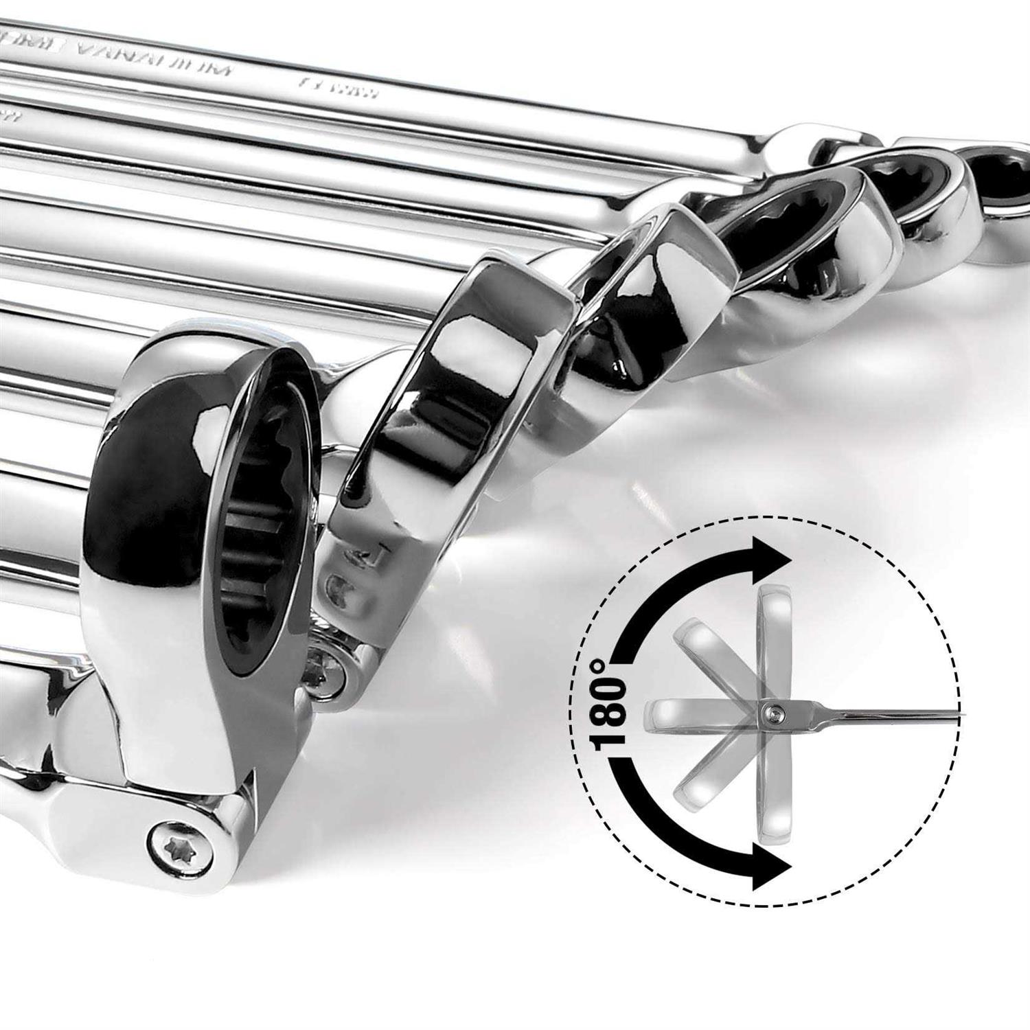 14×15 mm extra long flex-head box end wrench. Total length of wrench 36.3 cm (14.29 inch). Made of premium chrome vanadium steel, Heat treated for maximum strength, lasting durability. The unique ultra-long design can increase the torque, which is easier and more labor-saving than other box wrenches on the market. Two convenient sizes allow you to easily tighten or loosen more bolts simply by flipping the wrench over. It is convenient to work in a narrow space. The ratchet mechanism in the box end allows you to turn fasteners without removing and repositioning the wrench. 72-tooth ratchet gear needs a minimum of 5 degree swing arcs that is perfect for restricted, hard to reach work spaces 180 degree rotating flexible heads allow you to apply leverage at any desired angle and get around obstructions great for tight spaces design. Ideal for getting into tight spots. Practical design, widely applicable in industries as vehicle repairing and maintaining, machinery, electric power and Household making it ultra-versatile for a variety of tasks and jobs. 14*15mm Extra Long Flex-Head Ratcheting Wrench
