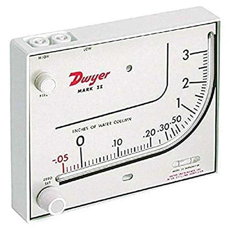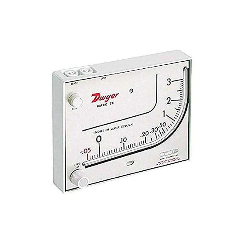 Manometers by Dwyer. Details:The Dwyer Mark II 25 inclined differential manometer with red gauge fluid has a 0 to 3 inH2O measuring range, built in zero level and molded plastic case for monitoring air velocity and air filter performance, and taking pressure measurements above and below atmospheric pressure. Red gauge fluid is freeze-proof and has lower evaporation rate for use in cold environments, and produces expanded scale viewing for improved reading resolution. The built-in zero level provides linear calibration. The manometer has a styrene-acrylonitrile housing, indicating tube, and fluid wells for strength and durability. The molded ABS knobs and zero adjust plunger and shock-mounted glass level vial are wear-resistant. Leakproof O-ring seals and overflow tank reduce the risk of fluid loss. Scales are lithograph printed on aluminum to ease reading, and are epoxy coated to protect against wear. The manometer can be mounted on any vertical surface.