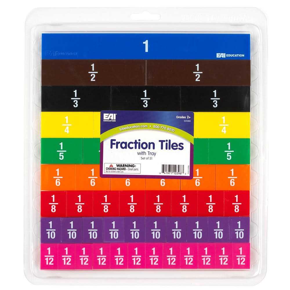- Nine-colorful proportional tiles representing 1 1/2 1/3 1/4 1/5 1/6 1/8 1/10 and 1/12. 51 piece set comes in a 9″ x 10″ plastic tray.