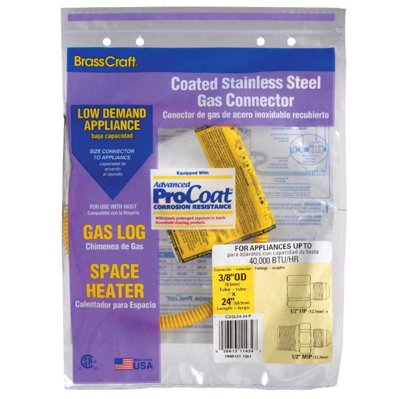 Eastman’s ProCoat stainless steel gas connector is engineered with added safety in mind. The proprietary polymer coating is designed to withstand prolonged exposure to harsh household chemicals, UV rays and salt. ProCoat is applied to the corrugated stainless steel connector using advanced powder-coat technology. Unlike conventional dipped or sprayed coatings, the ProCoat coating is baked directly onto the connector surface at high temperatures to provide a uniform coating over the entire length of the connector. Brand Name: Eastman Sub Brand: ProCoat Inlet Diameter: 1/2 in. Inlet Fitting Type: FIP Outlet Diameter: 1/2 in. Outlet Fitting Type: MIP Length: 24 in. Material: Stainless Steel Product Type: Gas Connector Application: Furnace and Boiler Packaging Type: Bagged Working Pressure: 1/2 psi Age Group: adult.