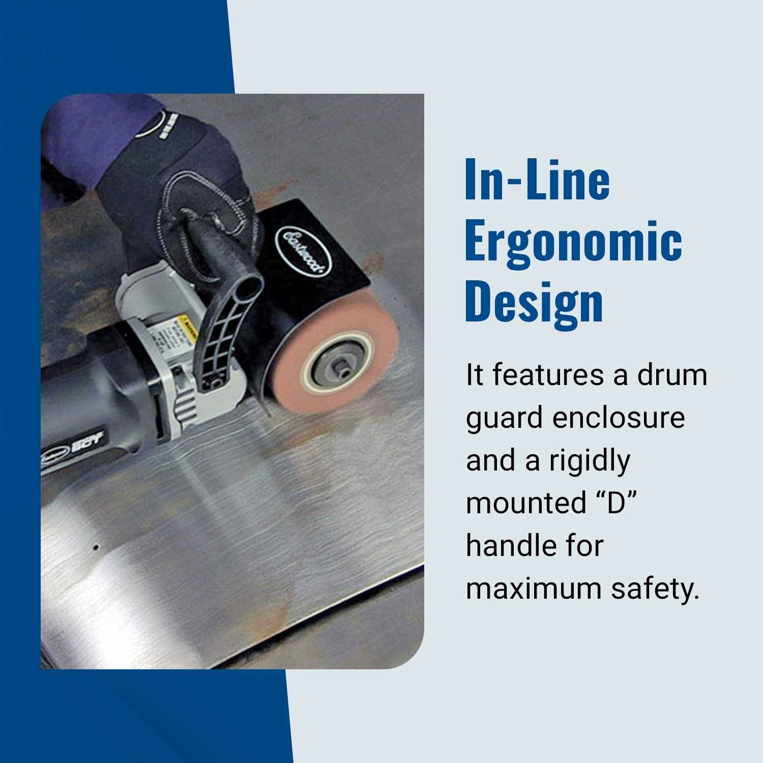 Its fully adjustable RPM and powerful 9 amp double-motor allows it to tackle even the most demanding materials and surfaces. The Contour SCT is also highly versatile, with the ability to use many Eastwood Drum options. In fact, the Contour SCT by Eastwood is also commonly used to sand wood and preparing your deck for a fresh stain or paint. A high-torque, ball bearing supported motor and hardened spur gears provide smooth operation and long life. Speed is easily controlled with a 6 position rotary knob and ON/OFF trigger control. In-Line Ergonomic Design Unlike other Surface Conditioning Tools on the market with an offset design the Eastwood Contour SCT has n ergonomic in-line design. The in-line design prevents torque load and keeps the drum turning so you can keep stripping the rust, paint and body filler without adding too much heat into the metal. The Eastwood CONTOUR SCT in manufactured with an all steel gear design for maximum torque and long life. This tool is built to last with an industrial style gear drive rather than a belt like you see on lesser quality tools. Versatile with Many Drum Options But there’s even more to this tool. If you need to remove paint, rust or body filler, attach the expander wheel with sandpaper or the abrasive drum, and quickly get your panels down to bare metal. In fact, the tool is even great for sanding wood and preparing your deck for fresh stain or paint.