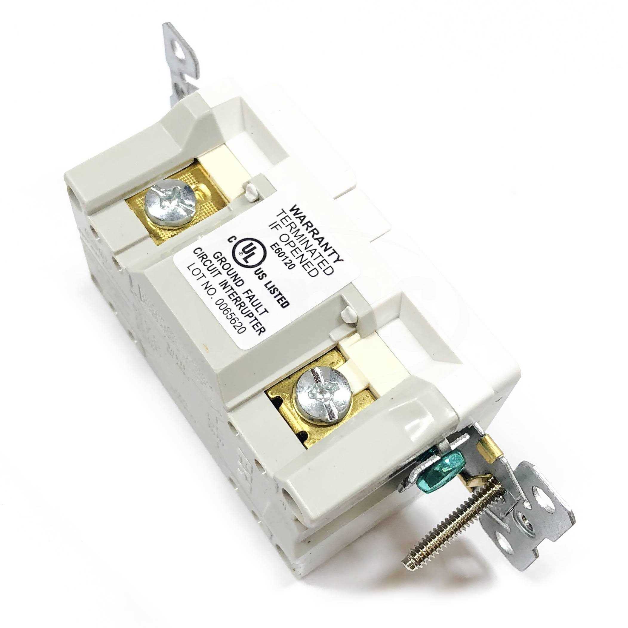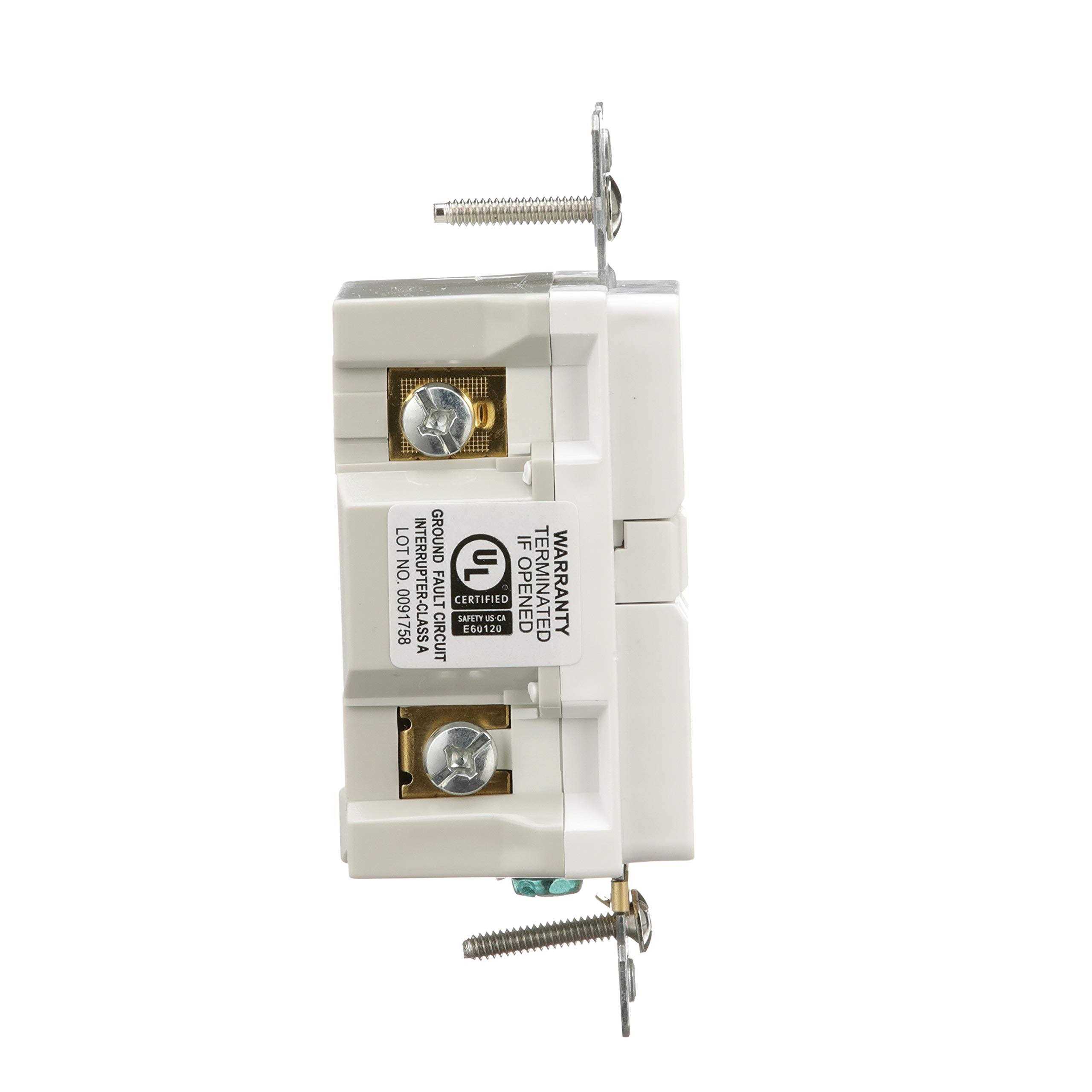 Specification grade receptacle with back and side-wired connection, accommodates wire of size 14 – 10-AWG. It has thermoplastic/polypropylene top housing and thermoplastic/PVC bottom housing. Receptacle has 0.03-Inch brass line contacts for optimal conductivity and heat rise resistance. It has dielectric strength of 2000-Volts. Ground termination with back-wire clamp offers secure wiring and reduces installation time. Tamper-resistant shutters prevents insertion of foreign objects. Receptacle has horizontal test/reset button alignment to provides larger unobstructed area. This receptacle has NEMA 5-15R configuration. It has 0.047-Inch thick steel, zinc-plated strap for corrosion resistance. It withstands temperature range of -35 to 66 deg C. It measures 1.68-Inch x 1.27-Inch x 4.2-Inch. It has V-2 per UL94 flammability rating to withstand hazardous environmental conditions. Receptacle is UL/cULus listed and CSA/NOM certified.