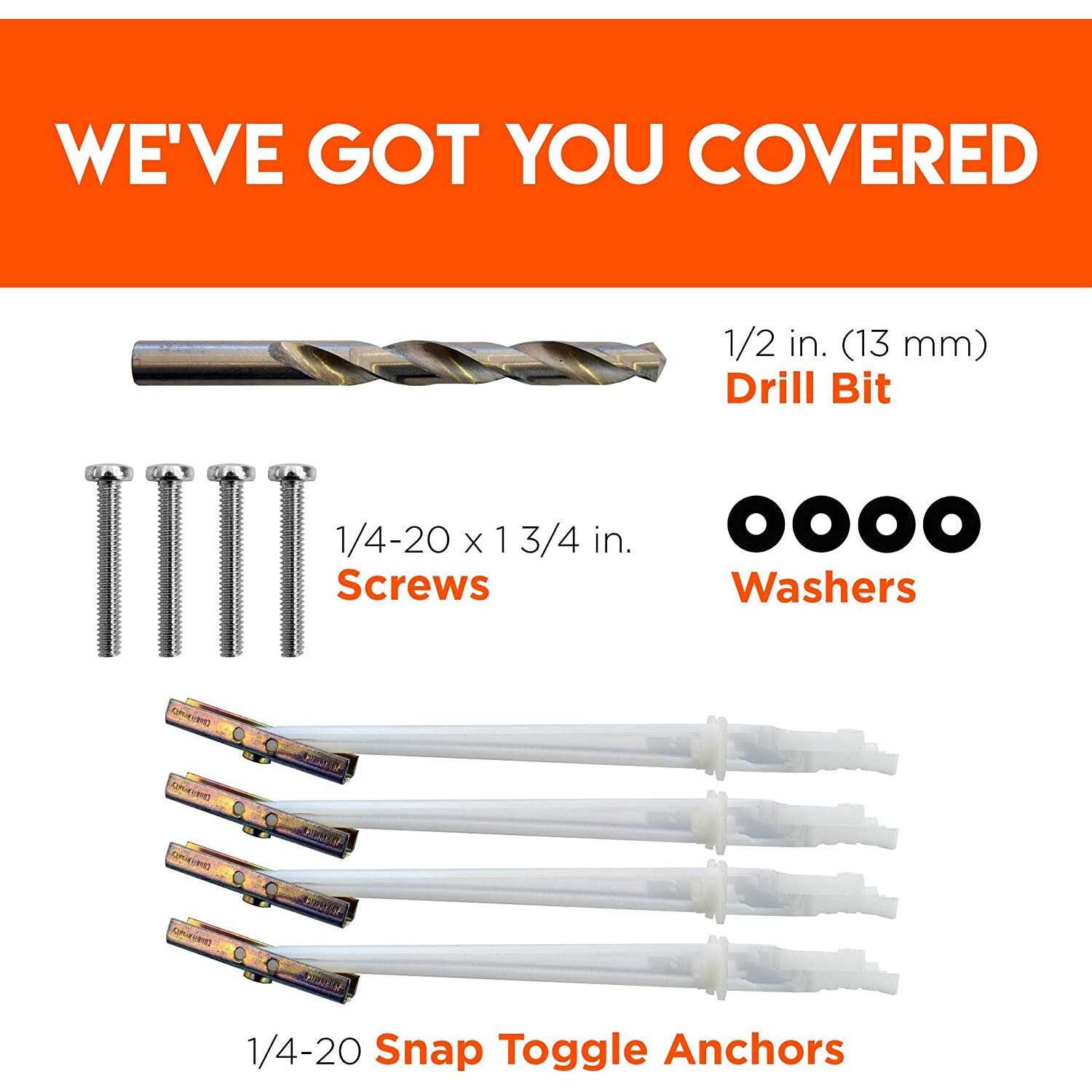 Included in this kit: 4 of their UL rated Snaptoggle anchors (1/4 x 20 x 1.75)No drill bit, no problem! It comes with this kit. You’ll just need a drill with a ½” chuck to complete installation.Includes 4 screws and washers to easily attach your TV mount to the SnaptogglesPractice safe mounting: Facilitates secure installation to steel stud walls, common in apartments and commercial construction.