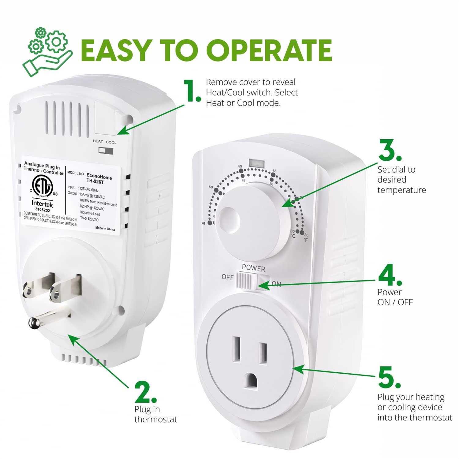 EASY TO OPERATE: Just plug in this adjustable thermostat, select heat / cool mode with the user-friendly switch and it will automatically turn on or off your heating or cooling devices through your preset target temperature. EFFORTLESS TEMPERATURE SETUP: This non-digital plugin thermostat comes with an adjustable temperature dial and the current temperature is displayed on the center for easy reference. Temperature control range is 41-86°F. SAVES YOU ON YOUR HOME ENERGY BILLS: You’re always a winner with this heating & cooling thermostat. It’s energy efficient while maintains a consistent ambient room temperature. VERSATILE USES: Suitable for most portable space heaters, window air conditioners, and circulating fans. Can also be used for refrigeration, fermentation, greenhouse fan and designed to suit almost any application you can imagine. SAFE & RELIABLE: This 3-Prong thermostat plug into a standard socket is ETL listed and rigorously tested for quality control and safety. Conforms to UL Std No. 60730-1, 60730-2-9. Rated Voltage is 125VAC 60Hz, Max Loading: 15A 1875W and has a recoverable overload short circuit. Dimensions: 5” x 2.5” x 2.5” Compatible with Most EconoHome Wall Mount Heaters