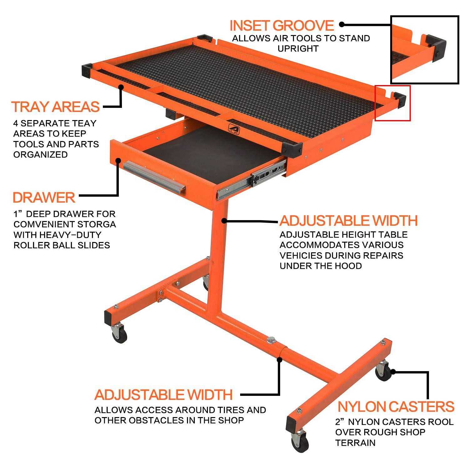 Height adjustable range is 34-47-3 / 4 inches, telescopic column control, height can be adjusted at will. The top tray with drawer design provides more space for various tools and items. The top tray of 28.9 ‘x 19.8’ x 1.0 ‘is designed for storing pneumatic tools, screwdrivers, crowbars, etc. The table consists of drawers and top tray liners, as well as rubber bumper corners for protection and top work surfaces with liners. It is made of durable steel with powder coating on the surface, with high quality of anti-corrosion and anti rust, ensuring enough durability and stability. Rolling table four 2 ‘x1.25’ rotary casters allow 360 degree movement, very suitable for your garage, workshop and other workplaces.