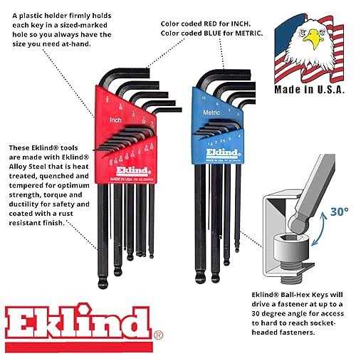 This EKLIND 13222 22 Piece Metric/SAE L-Shape Hex Key Set offers a comprehensive range of hex keys for tackling various fasteners. These L-shaped hex keys can be used across an extensive range of applications and product categories. This hex key set comes in a plastic holder that helps to keep the tools neat and tidy. The set comprises both metric and SAE hex keys that can reach into tight spots and provide control when needed. Each long arm hex key is made of alloy steel, which is also black oxide finished for durability. Their alloy steel handles provide better grip, especially in wet conditions. These hex keys are 6 3/4″ long, making them comfortable to use even in hard to reach areas. Whether you are a professional or hobbyist, you will definitely want to equip yourself with the EKLIND 13222 22 Piece Metric/SAE L-Shape Hex Key Set.
