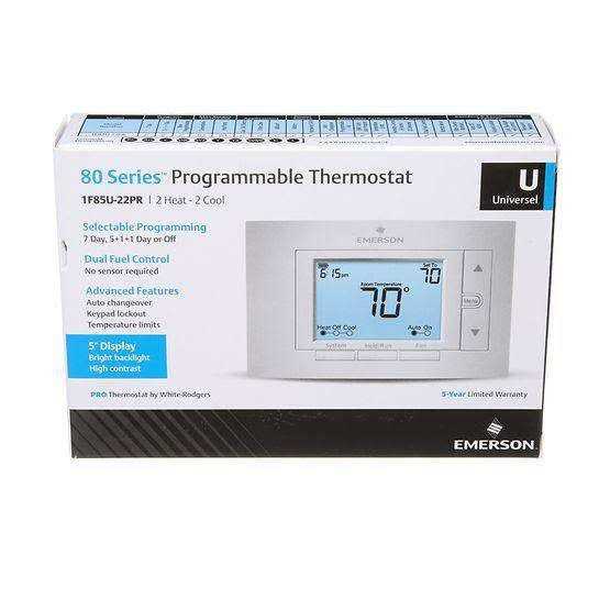 A large display bright back light and high contrast screen make this White-Rodgers Emerson 80 Series programmable thermostat as easy to read as it is to install. Built in level indicator easily navigable set-up menus and terminal block connections allow for easy installation. Once installed choose 7 day 5+1+1 day and 5+2 day programming no sensor required. Set temperature limits to save money with this universal model that includes an auto-changeover option.