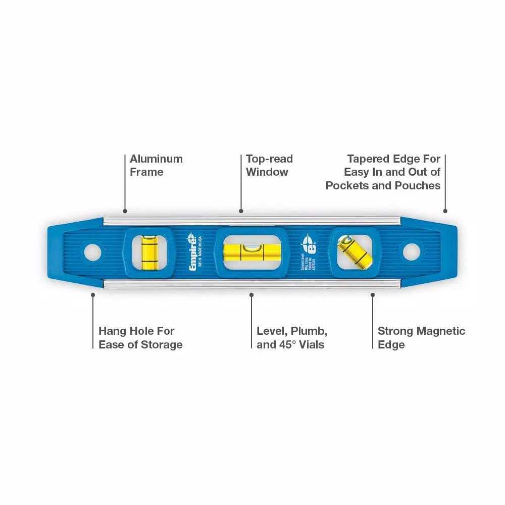 Get readings with an accuracy of as much as 0.0001-inch with the Empireandreg; Level 9-Inch Torpedo Level. It features a magnetic edge, which lets you attach it to metal surfaces and pipes while keeping your hands free for other tasks. The Empire Level 9-inch magnetic torpedo level has a solid aluminum frame that helps it survive even harsh working conditions and job sites. For improved accuracy, even after repeated use, the level’s acrylic vials are durable and long-lasting. The small, compact size of the Empire Level aluminum torpedo level makes it an ideal tool for tight spaces. While the level is small enough to fit in your pocket or tool box, it also features a hang hole for easy storage.
