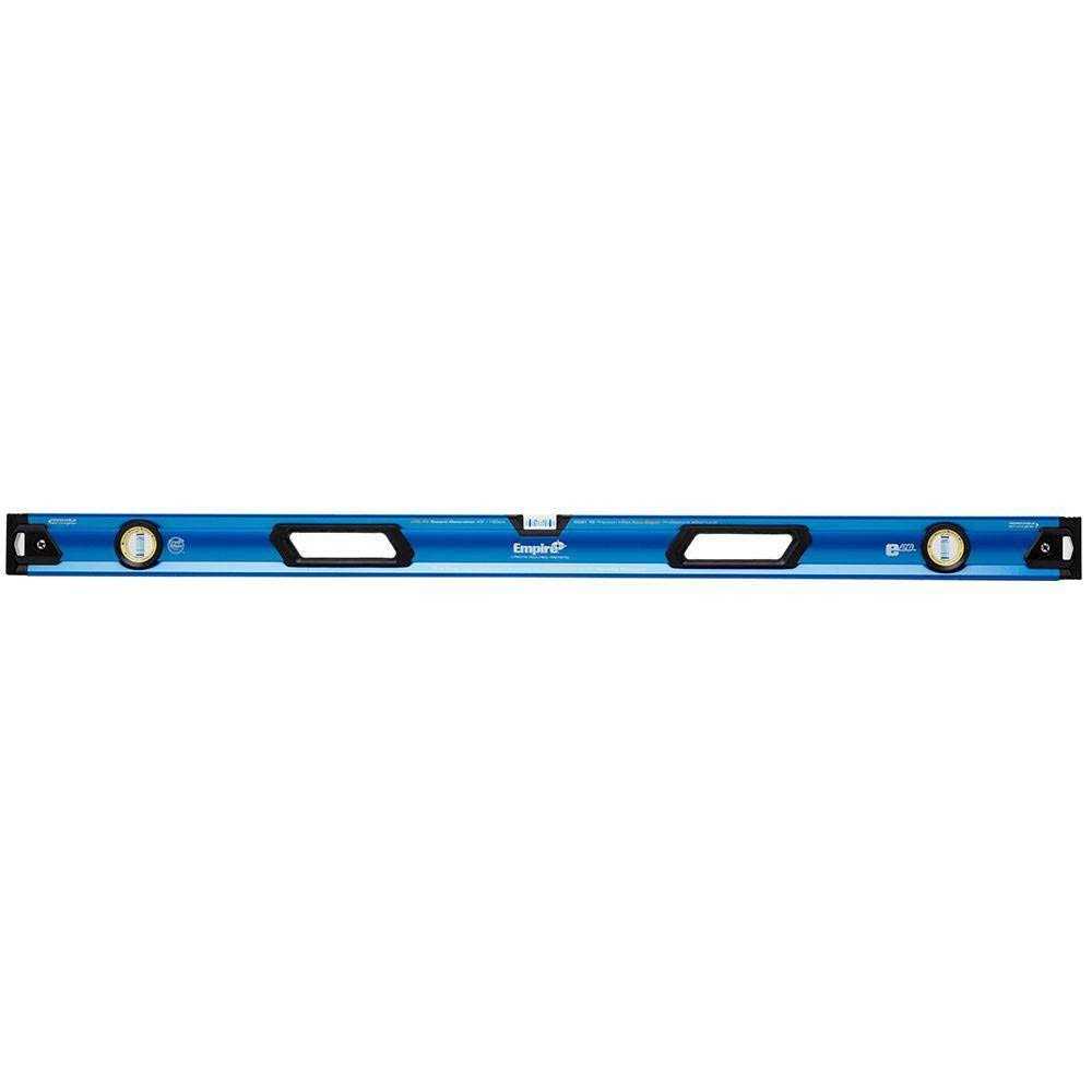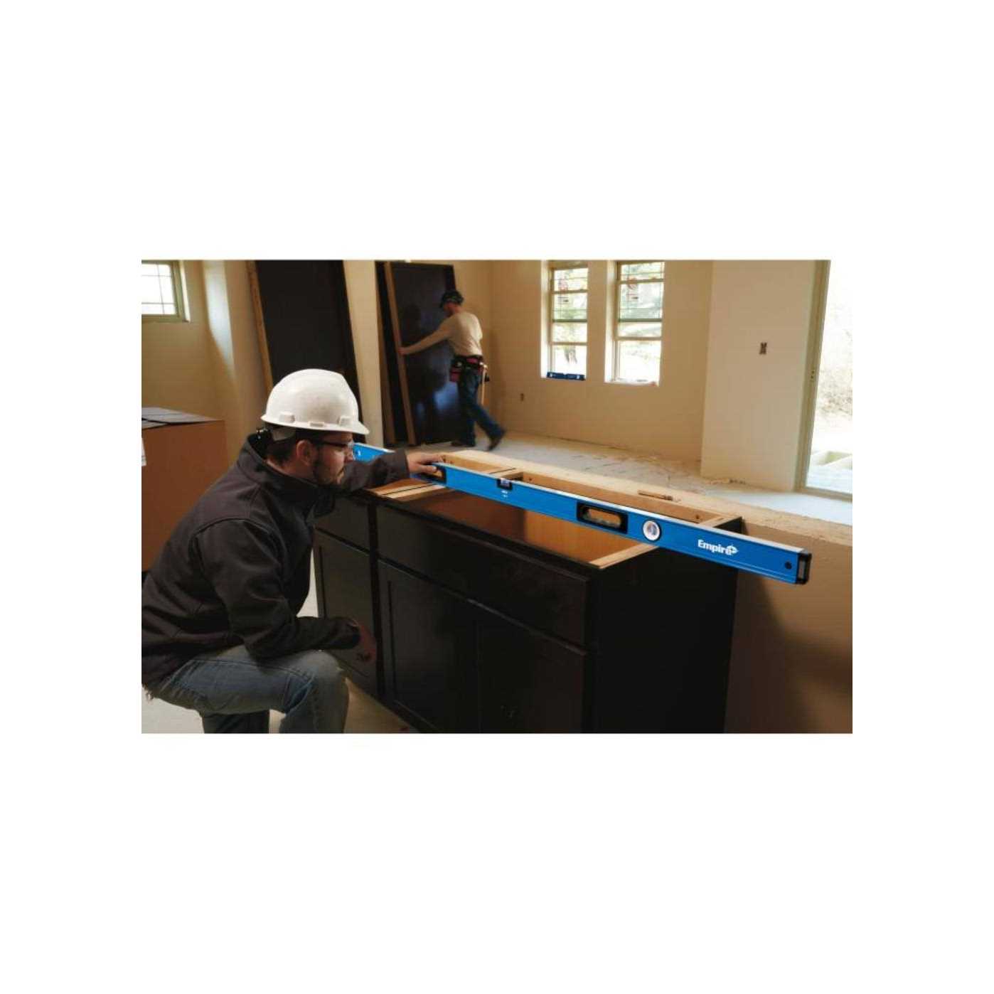Get precise layout and pitch lines on long horizontal, vertical and sloped surfaces with the Empire Level 96-Inch TRUE BLUE Box Level. Machine-milled edges ensure accuracy, even when working with uneven materials. Surface grippers hold it securely at any angle. The Empire level 96-inch True Blue box level contains level, plumb and 45-degree vials that are accurate to within 0.0005 of an inch. Each has an impact-resistant acrylic window containing e-BAND bubbles with high-contrast edges. The vials have a 300-degree viewing window so you can get readings on either side of the level. Reinforced housings keep the vials secured to the frame. The Empire Level all-metal frame box level contains two reinforced handles for grip control, a hang hole for easy storage and removable end caps to protect the level from impacts.