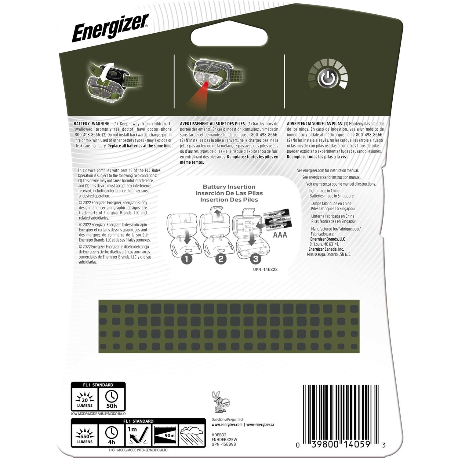 Energizer Vision HD+ 550 Lumen Extreme LED Headlamp, Includes (3) AAA Batteries Energizer Vision HD+ Extreme Headlamp packs outstanding performance into a compact LED headlamp with innovative features. Aim bright light onto your projects or activities, indoors or outdoors, from DIY projects to nighttime outdoor sports. With 550 lumens of light on high mode, this outdoor light shines up to 15X brighter than standard LED technology and illuminates objects up to 90 meters away. Red and green LEDs preserve night vision for outdoor activities, and VisionGuard protects your vision by gradually increasing the light intensity. Smart Dimming technology lets you control the light intensity with 7 modes to choose from, including high, low, wide, wide low, red, flashing red and green, to fit different lighting needs. This IPX4 water resistant headlamp is ideal in various conditions. A shatterproof lens extends the life of this LED light. This headlamp runs on 3 AAA batteries (included) for easy power. Energizer innovation lights the way.