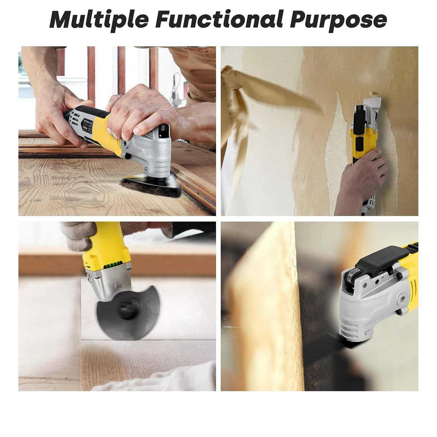 For any project you are working on, get it done faster and more efficiently with the Oscillating Multitool Saw Tool from Enventor. This saw has six speed settings ranging from 15,000 to 22,000 RPM. Pick the setting that is best for your uses, whether that be cutting, sawing, sanding, trimming, dressing, or grinding. This exceptional tool can cut through wood, tiles, piper, bolts, sheetrock, and more. It guarantees long-term usage as it has a three degree oscillating angle for maximum cutting performance. With a voltage of 120V, this powerful saw tool is a must-have for whatever task you are completing. The saw is equipped with a quick release level that will help you easily install accessories without the use of a wrench. To put on an accessory, pull the small safety level back and then push the main level back down to lock it after placing the accessory on the nose. There is an attached blade that can cut air ducts, screws, nails, cables, doorjambs, baseboards, and more. Getting the job down has never been easier. For efficiency and accuracy every time, get the Oscillating Multitool Saw Tool from Enventor.
