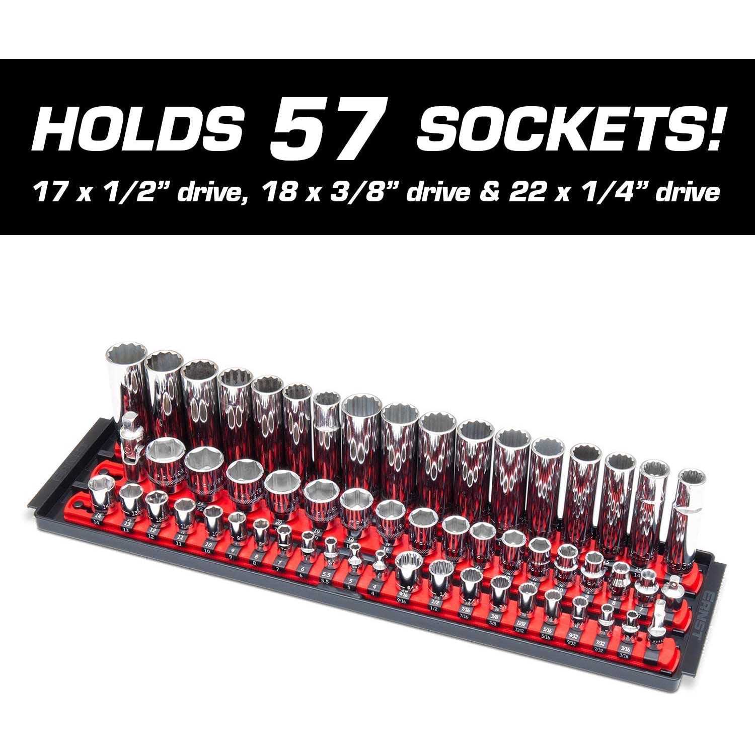 - Perfect for storage in the drawer, on the bench, or on the go; holds 57 sockets