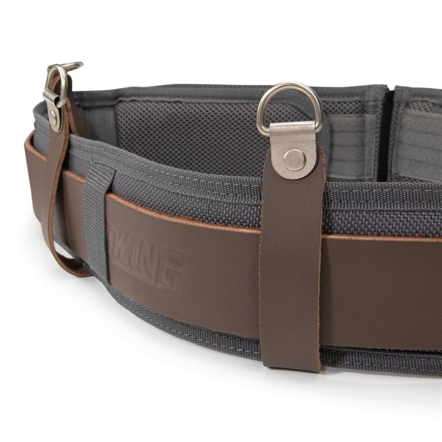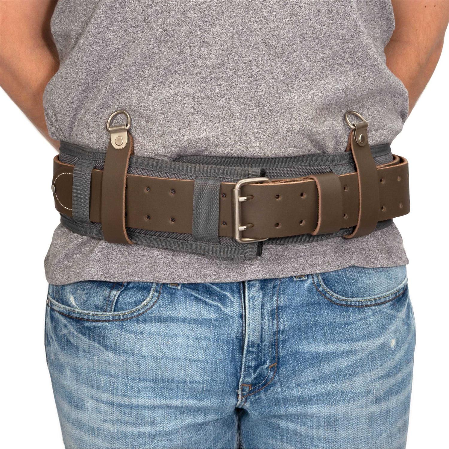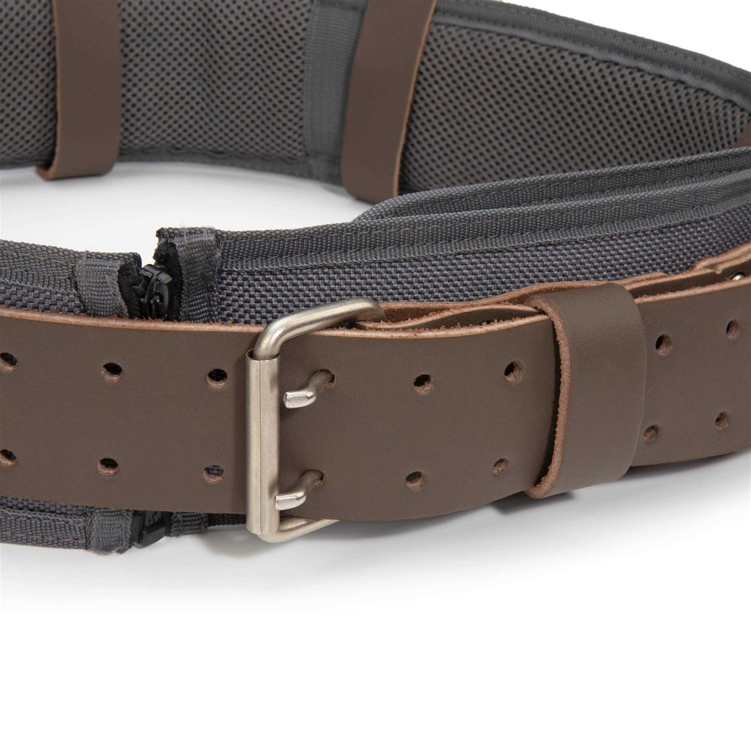 Designed and constructed for maximum utility and ultimate reliability this Estwing belt combines a top grain cowhide leather belt with a 4-inch wide padded mesh liner to make a great base with which to assemble a custom tool belt perfect for your needs. The belt secures with a durable steel dual pronged roller buckle that can easily support the weight of several fully loaded tool pouches attached to the belt. A series of 5 d-ring loops allows the attachment of a set of work suspenders for additional support carrying heavy loads. The padded inner liner also has a zipper-secured extension that can be detached for smaller wearers for a better fit with less pad overlap. The 2-inch wide outer belt fits most brands and styles of tool pouch single tool holder or drill and impact driver holster. Fully adjustable the belt can fit waist sizes from 30 to 57-inches.