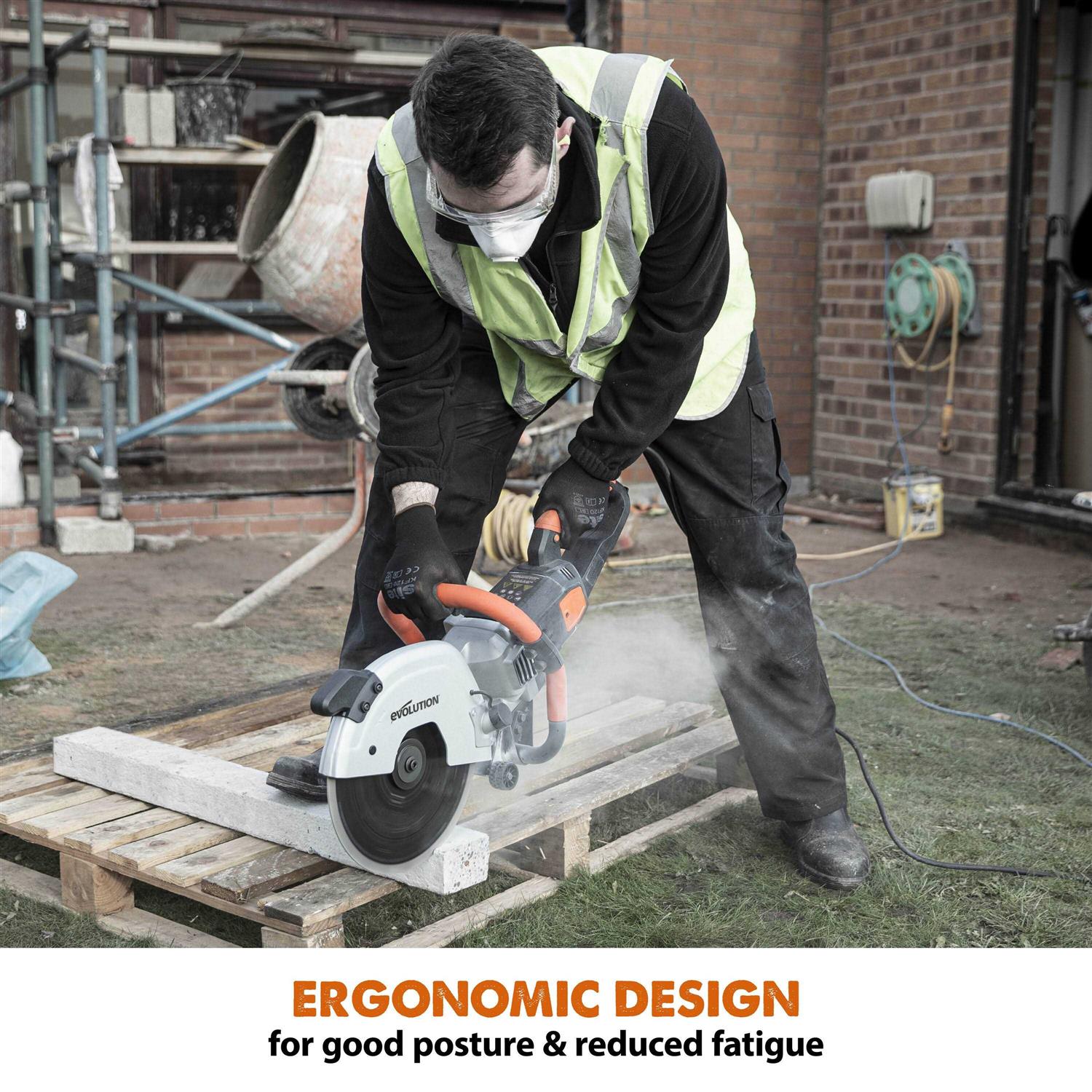Evolutions new and improved R300DCT 12-inch concrete cutting saw is redesigned from the ground up. Cutting an extra inch vs our existing 12-inch model. Perfect for both indoor and enclosed spaces, our saw doesnt emit any harmful fumes. Plus, you dont need to worry about expensive fuel or servicing! With a high torque 15A electric motor it delivers consistent power, stopping it from slowing down under heavy load. The new wheeled skit plate makes cutting at ground level easy and keeps the blade off the ground so it can be put down while the blade is still spinning. All of our new DCT models come equipped with our new Power Protect Technology. Which saves the saws internal parts from dust and water ingress. Improving the tools motor life!