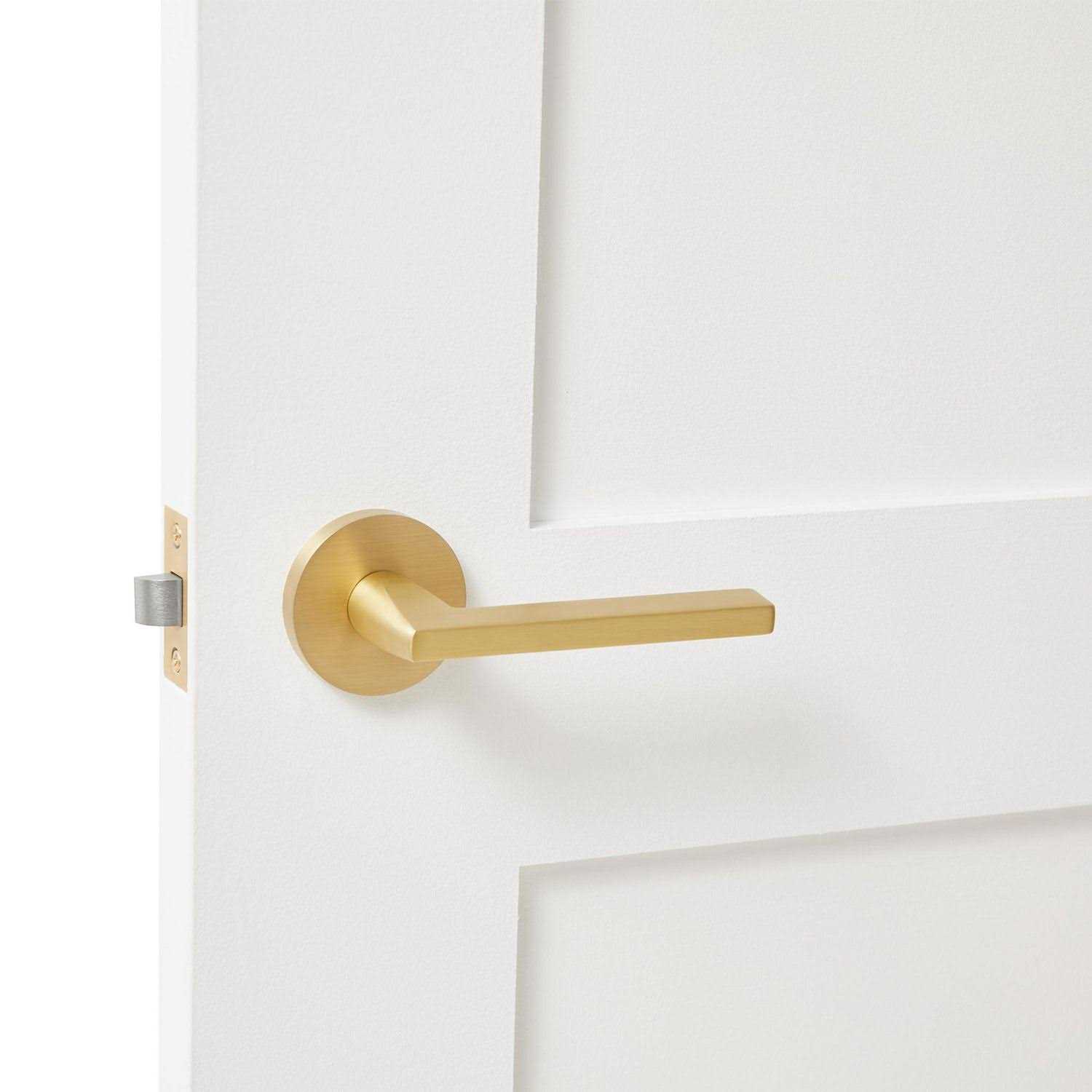 This door handle is cast from a single piece of solid brass. It has a contemporary style and it is paired with our round rose/backplate. This timeless design has smooth edges for an elegant feel. The finish is satin brass.
