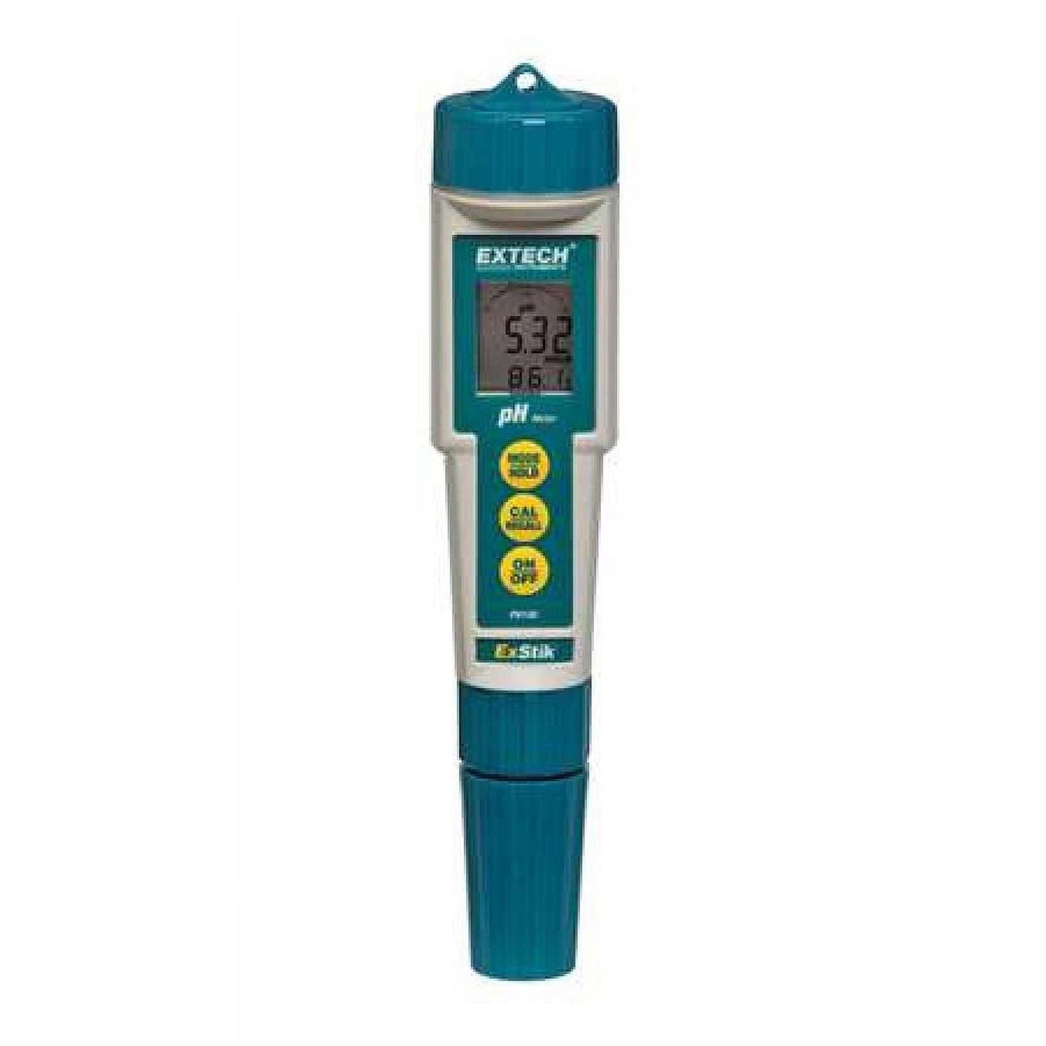 The waterproof ExStik PH100 pH meter by Extech is an accurate, rugged and reusable stick pH meter with some unique data storage features that make it exceptionally easy to use and considerably enhance its usability. The flat surface electrode allows you to measure pH in liquids, semi-solids and solids and limits electrode breakage and clogged junctions. The Renew indicator tells you when it’s time to replace your electrode. The CAL alert ensures consistently accurate readings by telling you when you need to recalibrate. A Memory feature records and recalls 15 sequentially tagged readings, so you will know how your readings have changed over time. The LCD readout displays pH, temperature and an analog bargraph that shows trends in acidity or alkalinity and indicates when the reading is stable. 1, 2 or 3 point calibration automatically recognizes buffer solutions. Other features include automatic temperature compensation, auto power off, low battery indicator and data hold. The PH100 comes with a protective sensor cap, sample cup, four 3V CR2032 button batteries and a 48 in. (1.2 m) neck strap. For more convenience, purchase the EX006 weighted base, which holds both the sample cup and ExStik meter.