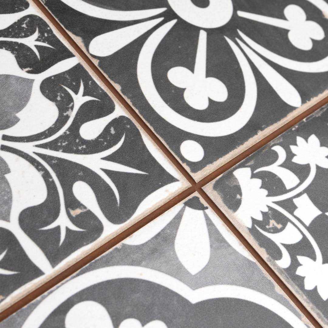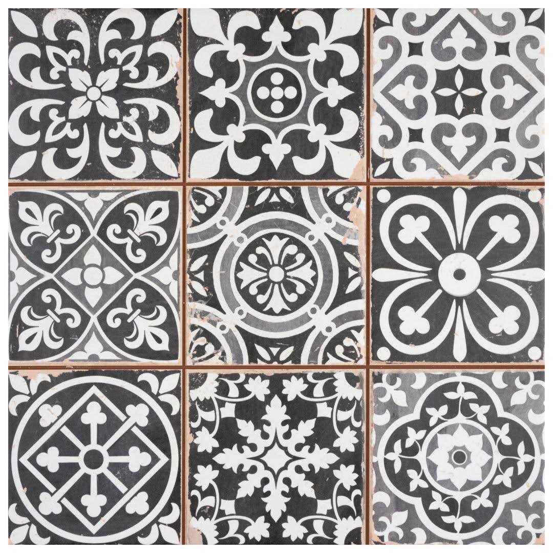 It is easy to picture the sun-drenched streets of Spain when looking at our Faenza Series 13″ x 13″ Ceramic Patterned Wall & Floor Tile. Save time and labor spent arranging smaller square tiles and instead install these durable ceramic slabs, which have nine squares separated by scored grout lines. This breathtaking black glaze features a collection of encaustic-inspired designs. Imitations of the scuffs and spots that are the marks of well-loved, worn, century-old tile and the rich red tones peeking through are the perfect contrast to the faded grays and black. These rustic scuffs and spots convince us that this tile is truly aged. There are 3 different variations of scuffs and pattern arrangements available that are randomly scattered throughout each case, offering a sporadic patchwork look. Designed by interior architect and furniture designer Francisco Segarra, this tile is a true reflection of vintage industrial design. The scored grout lines can be grouted with the color of your choice to further customize your installation.