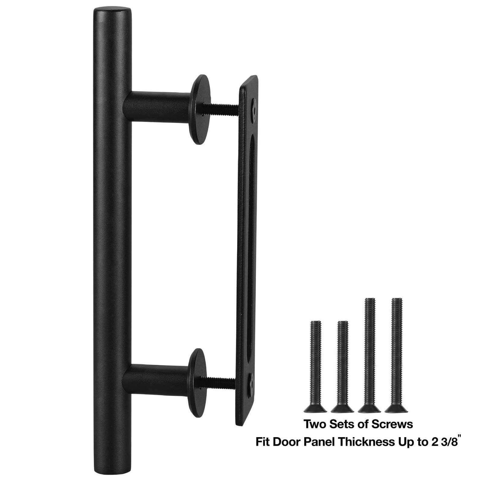 The pull handle kit is designed according to the features of the barn door. It can not only improve the beauty of the barn door but also ensure the safety of the use of the barn door. It is good for wood, glass and aluminum doors. For both interior and exterior doors.This pull handle kit includes a bar handle and a flush pull. It is very easy to install. The through-bolt connects the pull handle and the flush pull plate. Made by high quality steel. Package includes: A pull handle, a flush pull plate, two screw and a L wrench.