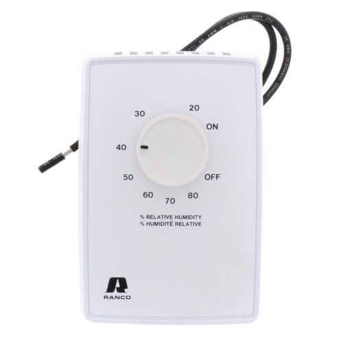 Wall mounted dehumidistat. Adjustable between 20% and 80% relative humidity. A white powder-coated finish.