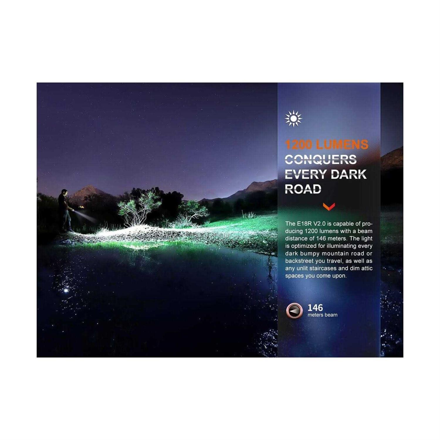 - The Fenix E18R v2.0 rechargeable flashlight delivers a 1200 lumen beam with distances up to 159 yards. USB-C RECHARGEABLE.