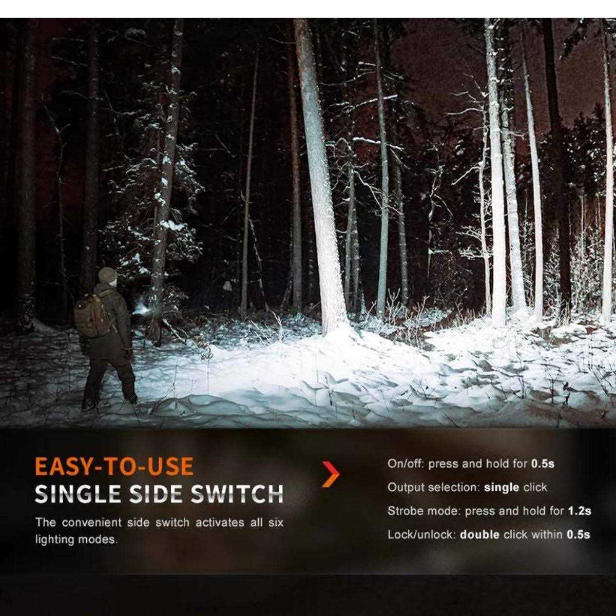 Explore the Fenix E35R LED flashlight, engineered for outdoor use with 3100 lumens and a wide beam. This EDC flashlight is fitted with Intelligent Overheat Protection (IOP) for elevated heat resistance, plus a comfortable grip and 6 illuminating modes accessed with a side switch. A double-click lock/unlock within 0.5s is also available. The Fenix ARB-L21-5000 V2.0 battery provides up to 69 hours of Eco mode illumination – get your E35R Flashlight now! Get a free AOD-S V2 Diffuser Tip with the purchase of your new E35R. Perfect for a gift or just to get yourself a great bonus accessory at no extra cost!