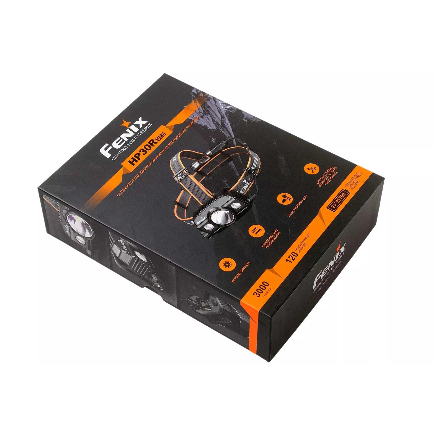 Uses 1 x cool white LED and 2 x neutral white LEDs to produce a max output of 3,000 lumen max output and 270m beam distance with both spot and floodlight Wide 100 degree floodlight beam to light up a large area Powered by 2 x 5000mAh 21700 Li-ion batteries USB-C rechargeable and can be used as a powerbank 2m impact resistant and IP66 waterproof rating The Fenix HP30R V2.0 is a high performance rechargeable headlamp featuring 3 LEDs to produce both a spotlight and floodlight. The 3 LEDs can be combined to produce a max output of 3,000 lumens and 270m beam distance or they can be used independently. The HP30R V2.0 offers long runtimes from the seperate battery pack which consists of 2 x 5000mAh 21700 Li-ion batteries and can be mounted at the back of the headband or in another location with the extension cable. The battery pack is conveniently rechargeable via the USB-C port and the battery pack also doubles as a power bank for charging other devices. There are multiple brightness levels available within the spotlight and floodlight modes which makes it versatile for a wide range of activities. Other features of this powerful headlamp include battery indicator, 2m impact resistance, IP66 waterproof rated and 60 degree adjustable beam angle.
