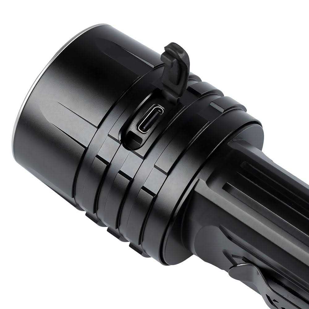 One of the brightest flashlights ever made by Fenix the Fenix LR35R flashlight throws a powerful 10000 lumen beam at over 546 yards great for search and rescue or outdoor adventures like hunting spelunking or exploration. It has an incredibly easy-to-use single side switch for all operations allowing you to quickly cycle through five modes and access strobe. All of this power fits comfortably in the palm of your hand. At only 5.5 inches in length this powerful flashlight can be comfortably carried or included in any outdoor kit. The LR35R comes with 2x cold resistant 21700 batteries that yield up to 80 hours of maximum runtime. Plug the included charging cable into the protected USB-C port for fast and convenient charging. The side switch has a built-in battery level indicator so you are never in the dark. You can also save battery by locking the LR35R with a simple double tap of the side button just double tap again to unlock. The LR35R is machined from durable aluminium alloy and is IP68 rated waterproof a high quality tool for all long range applications.