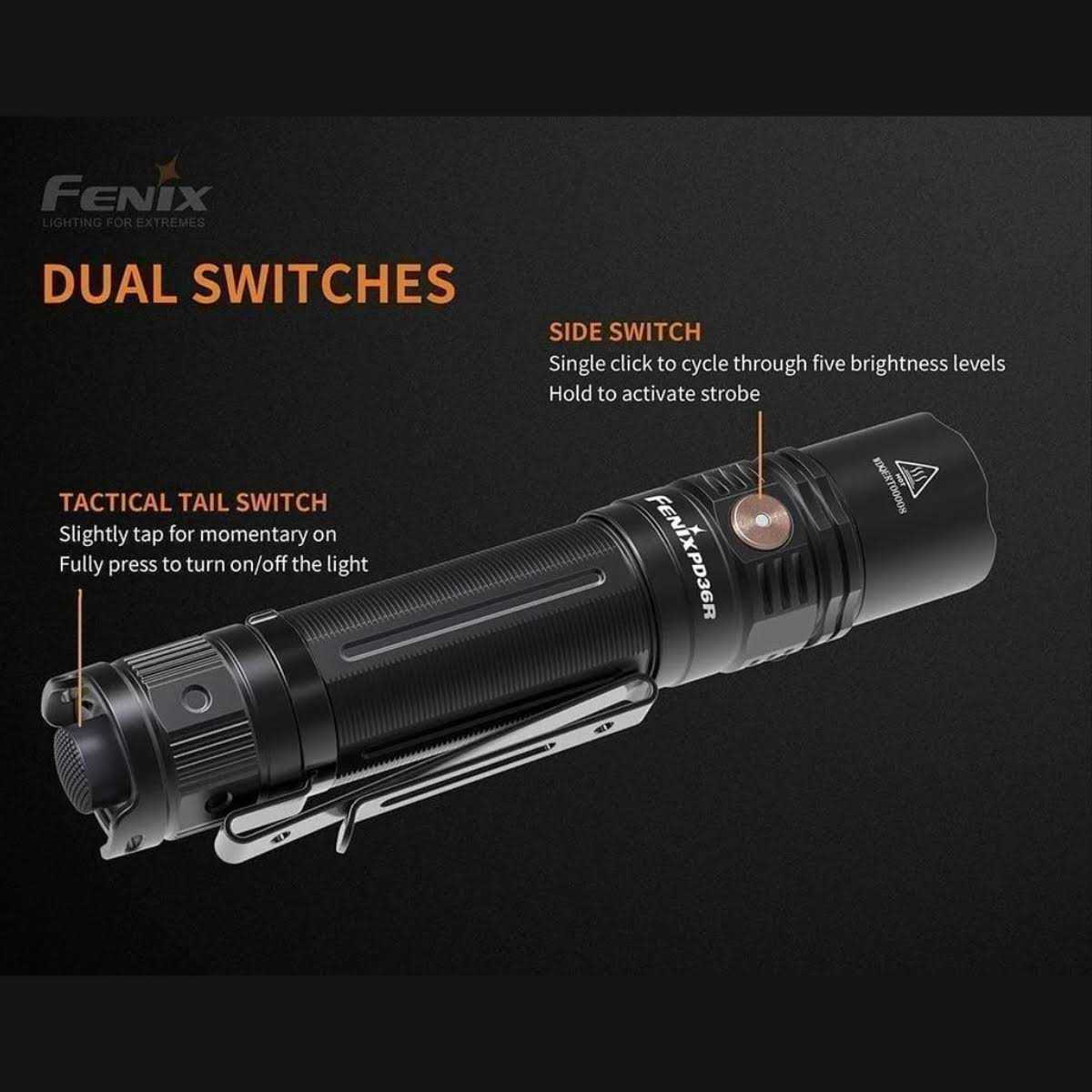Designed for tactical and professional applications, the Fenix PD36R PRO Tactical Flashlight has an assortment of different features, including a detachable tail cap allowing use of a tactical pressure switch. The max output of 2800 Lumens and 36,600 candela on the turbo setting casts a beam distance of 1250 feet. The PD36R PRO brings a 75% upgrade in lumens from the previous PD36R model and adds the tactical dual tail cap switches. Instead of turning the flashlight with tail switch and adjusting the outputs with the side switch, you now have access to both power and brightness on the tail cap in a tactical grip. This upgrade also gives access to a true-instant strobe. If the light is off, pressing the output selection switch will instantly begin strobe and it will remain on while you hold down the button. Perfect to quickly disorient a threat. The tail cap redesign also allows the use of tactical accessories like the AER-05 Remote Pressure Switch and the ALG series weapon rail mounts. The PD36R Pro includes the ARB-L21-5000 V2.0 rechargeable 5000mAh 21700 battery which can be recharged directly without an external charger by using the onboard USB-C charging port! You can also use 18650 batteries with the ALF-18 battery adapter. The light is only 5.74 inches in length and 1.04 inches in diameter and weighs just under 6 oz. Made with a high-strength aluminum, this powerful flashlight can handle the elements and drops of 1.5 meters on all sides. To protect all that functionality, the Fenix PD36R Pro has been IP68 waterproof rated, allowing it to withstand being underwater at least 6.5 feet for 30 minutes.