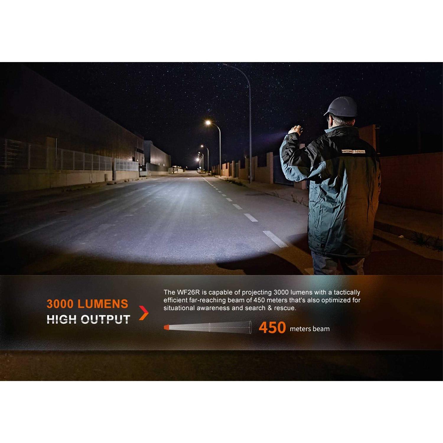 - The Fenix WF26R is capable of a 3000 lumen max that can reach up to a 492 yard beam throw. EASY TO OPERATE.