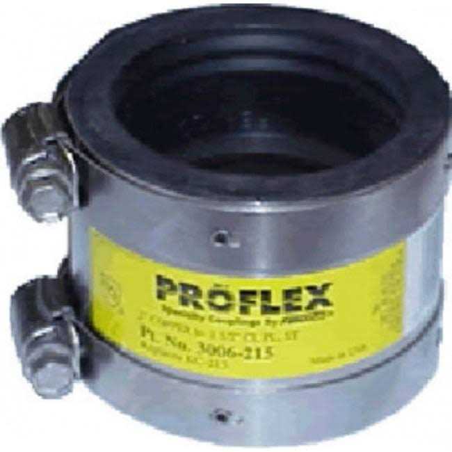 Proflex Fernco Cast-Iron Plastic Steel Couping 2″ x 2″ Provides a connection between similar and dissimilar pipe materials and sizes without the use of bushings. The internal pipe stop insures proper installation and reduces noise and vibration. The outer shear ring and clamp assemblies conform to ASTMA A167-91.