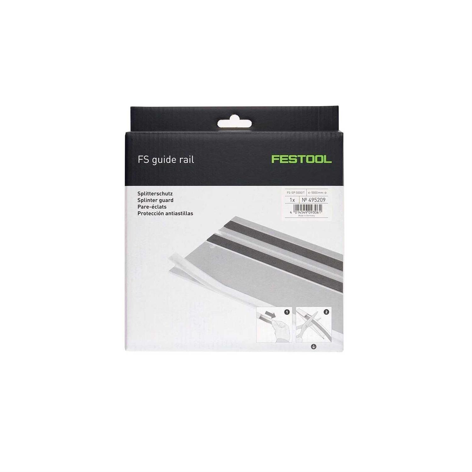 Power Tools Replacement Parts by Festool. Details: Festool FS Guide Rails are available in eight different lengths from 32 inches to 197 inches (800 – 5000 mm), providing the right length for straight, splinterfree cutting in just about any application. The integrated splinterguard is a critical guide rail system component, and after some time and heavy use, will need to be replaced. Replace your splinterguard as needed to ensure perfect alignment of your guide rail to the cut line, and to protect against tear out, on cuts both with the grain and across. Though you should expect many cuts from your original splinterguard, its life expectancy is heavily dependent on your application. Keep your cuts perfectly splinterfree by periodically replacing your splinterguard, especially if you are switching between blades, or using the guide rail with more than one saw. Clear splinterguard enhances visibility of cut line. Includes one 197in (5000mm) Clear Splinterguard.