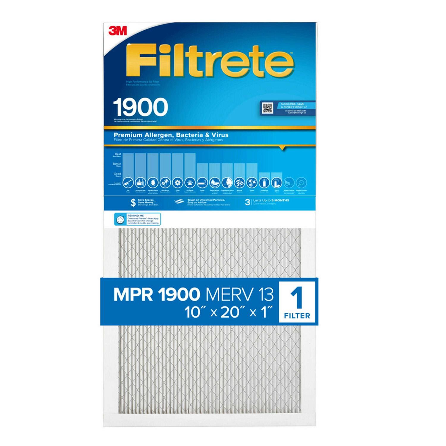 Filtrete 10x20x1 MPR 1900 Air Filter, made by 3M, helps capture unwanted particles from your household air to contribute to a cleaner, fresher home environment. Designed with exclusive Filtrete 3-in-1 technology, including a high MPR 1900 and MERV 13 rating, your AC filter will help pull and capture countless microparticles – such as pet dander, smoke, candle soot, bacteria and viruses – while letting cleaner air flow through. Your Filtrete Filter will also capture large particles, including lint, pollen and household dust. Use a 3-month pleated 1-inch home HVAC filter in your furnace, air conditioner or HVAC system. For optimal performance of your heating and cooling system or HVAC system, change your furnace filter at least every 90 days. The No. 1 Recommended HVAC Air Filter Brand (1), Filtrete Home Air Filters help capture particles both large and invisible, to create a cleaner, healthier home.