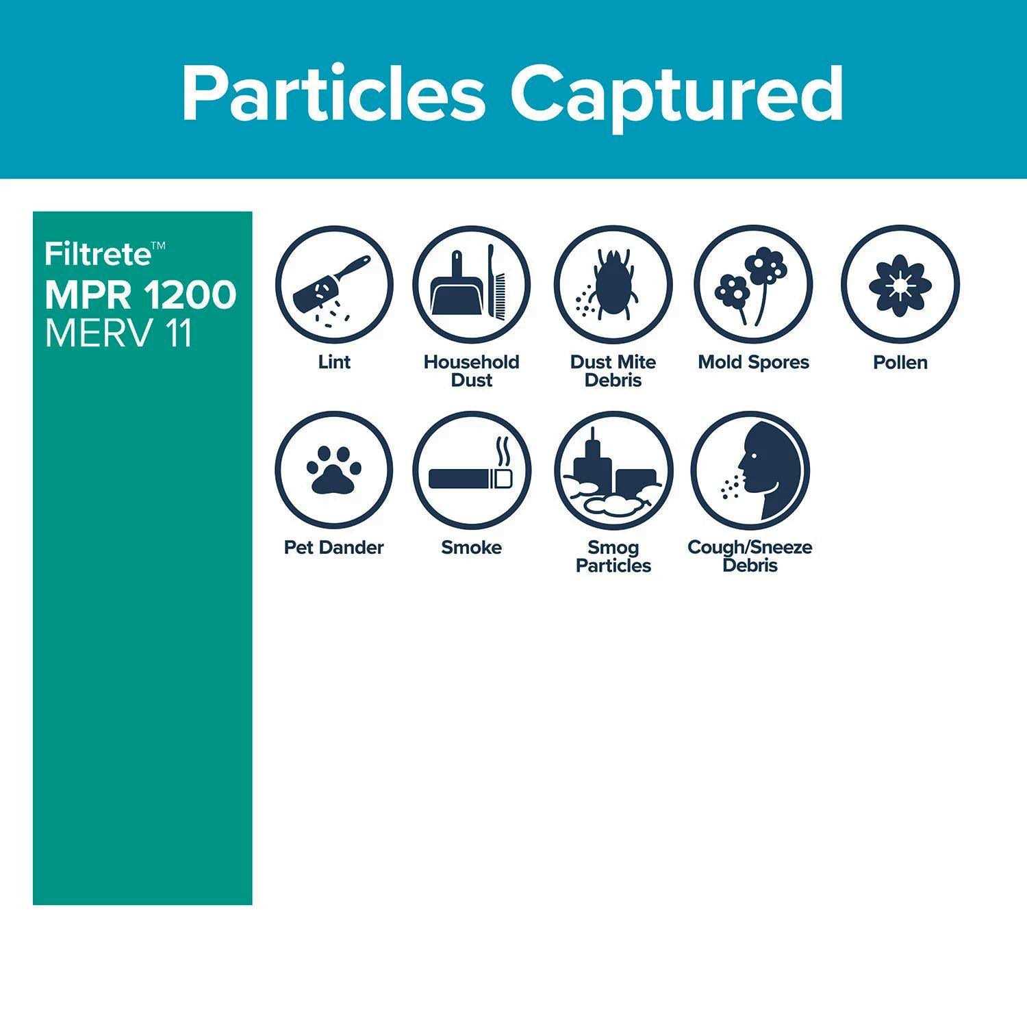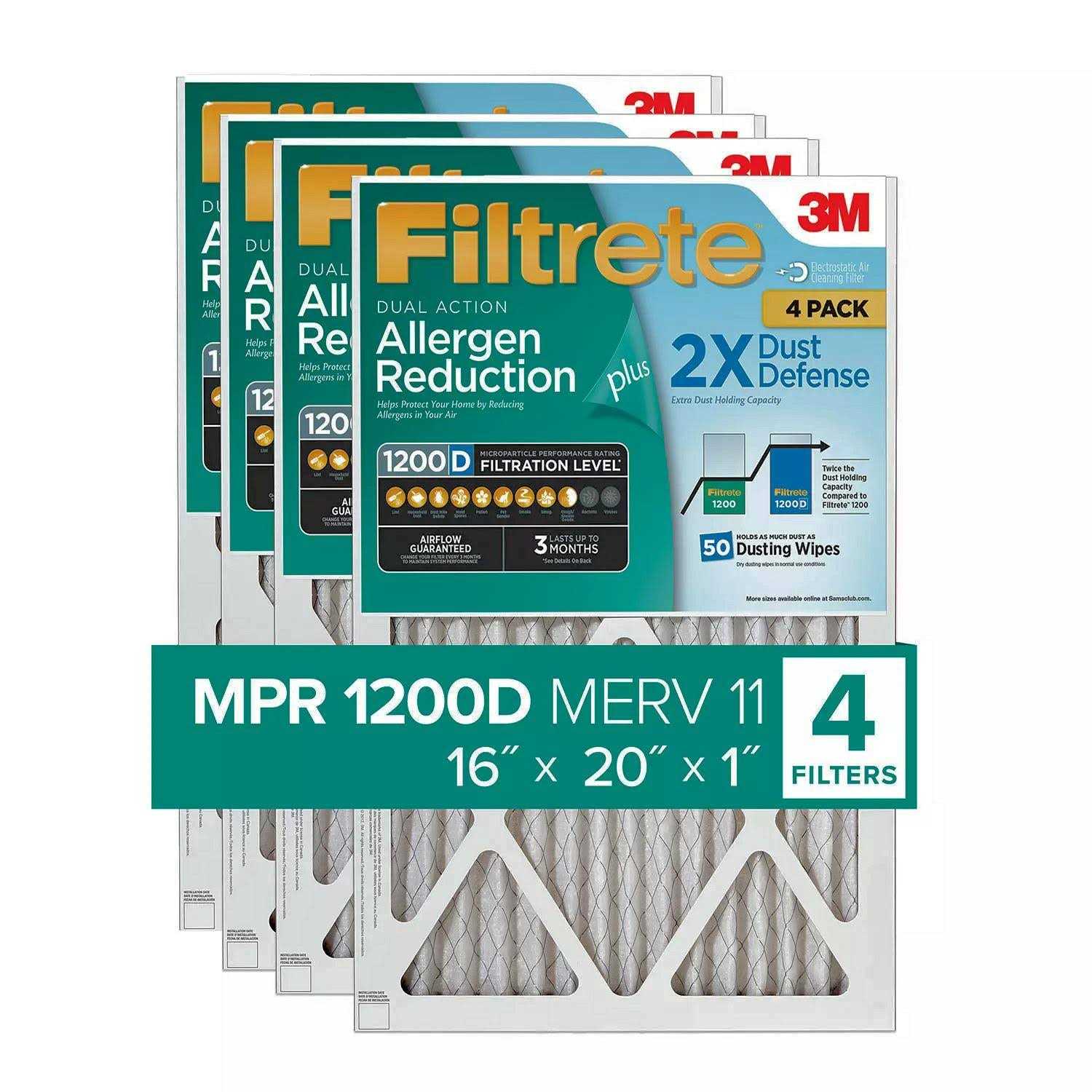 Holds as much dust as 50 dusting wipes** (**Dry dusting wipes in normal use conditions) OUTPERFORMS FIBERGLASS, WASHABLE AND NON-ELECTROSTATIC 3-month pleated 1 in. home air filters for your furnace, air conditioner or HVAC system DESIGNED WITH EXCLUSIVE Filtrete Brand 3-in-1 technology from 3M to trap unwanted air particles while letting cleaner air flow through ATTRACTS AND CAPTURES particles such as lint, pollen, dust, pet dander, smoke and smog Filtrete 1200D MPR has a rating of MERV 11 The higher the MPR, the more microparticles–such as pollen, pet dander, smoke, bacteria and viruses–your filter will capture from the air passing through it FIND YOUR SIZE: MPR 1000, MPR 1200 and MPR 1550 available in 4 in., 4 in. slim fit and 5 in. thick air filters FOR OPTIMAL PERFORMANCE of your heating & cooling system or HVAC system, change your home air filter at least every 90 days for 1 in. filters, and at least every 12 months for 4 in. and 5 in. Filters A dirty filter will slow down air flow and make the system work harder to keep you warm or cool–wasting energy. Sign-up for a filter change reminder program that works for you! FOR RESIDENTIAL use only