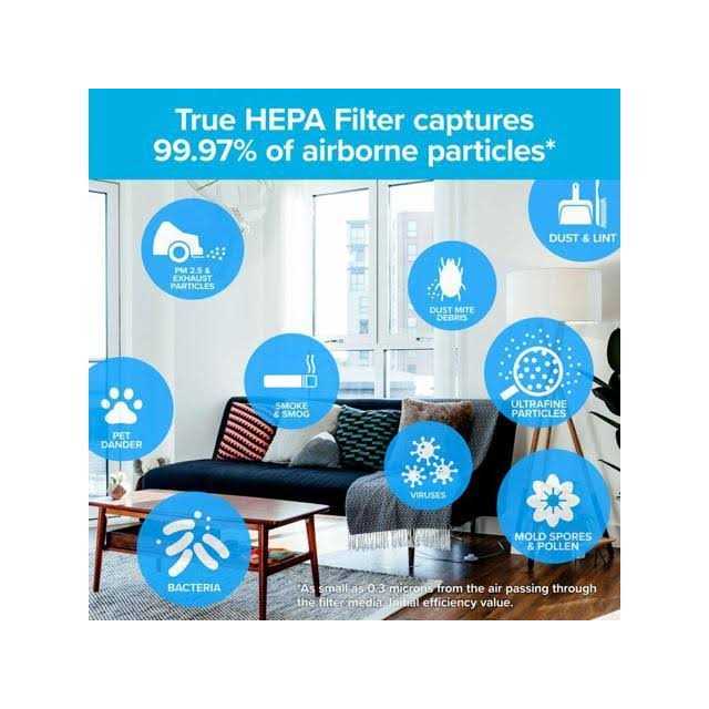 - True HEPA filter captures 99.97% of airborne particles, including dust, allergens, bacteria and viruses