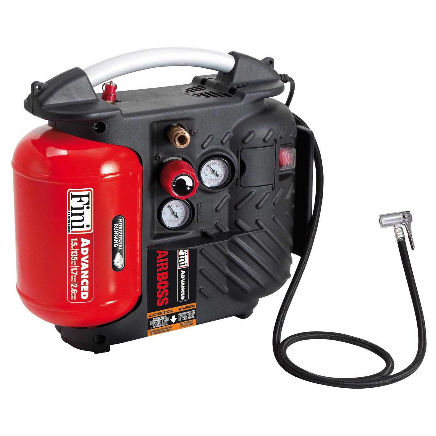 Fini’s Airboss Combo Kit includes a premium 25 ft. PVC hose with industrial quick-connect fittings, portable 1.2 Gallon air compressor and a 2 in. Perfect for installing decorative moldings and woodworking projects, the nailer’s universal magazine accepts all brands of 18-Gauge nails from 3/8 in. up to 2 in. lengths. The compact design of the Airboss compressor makes it ideal for work on any level! The Airboss delivers 1.5 HP and 135 PSI to power even the largest nailers and staplers, but can also inflate RV, truck and car tires up to 135 PSI as well. The 120V electric motor provides fast recovery from 110 PSI to 135 PSI in only 15 seconds, and advanced Oil-Free pump technology with sound filtration reduces operating noise to only 73 db A. The Airboss compressor starts easily in cold weather and never leaks oil or contaminates on the worksite. Additional smart features include a robust metal handle and impact resistant shroud for added durability, a ball-valve tank drain requires only a quarter turn to drain the tank, and built-in storage for air hose, power cord and other accessories. 1.5 HP 120V electric motor starts easily in cold weather. 135 PSI maximum operating pressure and 1.8 Scfm @ 90 PSI for optimum tool performance. Vertical hot dog style tank design for jobsite portability. Long lasting maintenance free oil-free pump. Built-in handle for easy portability and transporting around the jobsite. 18-Gauge Brand Nailer, 1.2 Gallon 1.5 HP Oil-Free Hand Carry Compressor, 25 ft. Premium PVC Hose, Quick-Connect Fittings.
