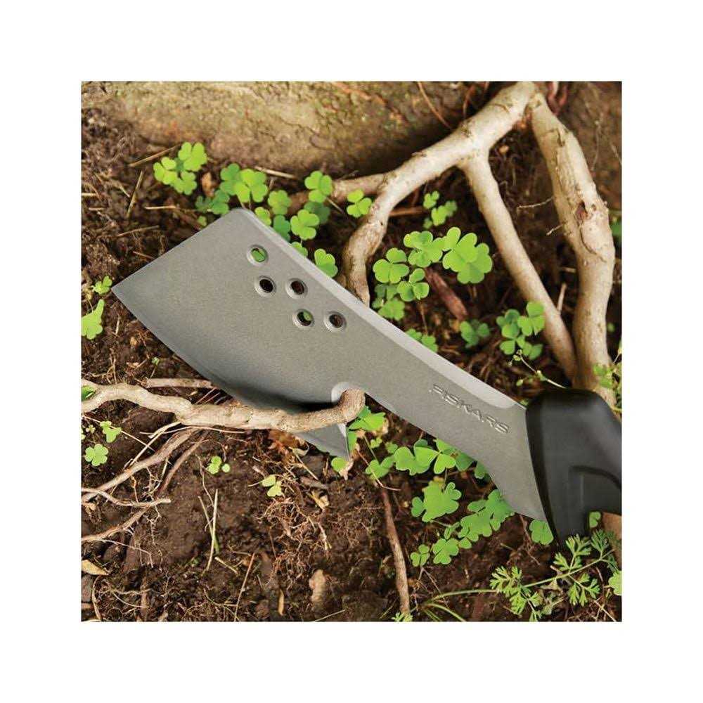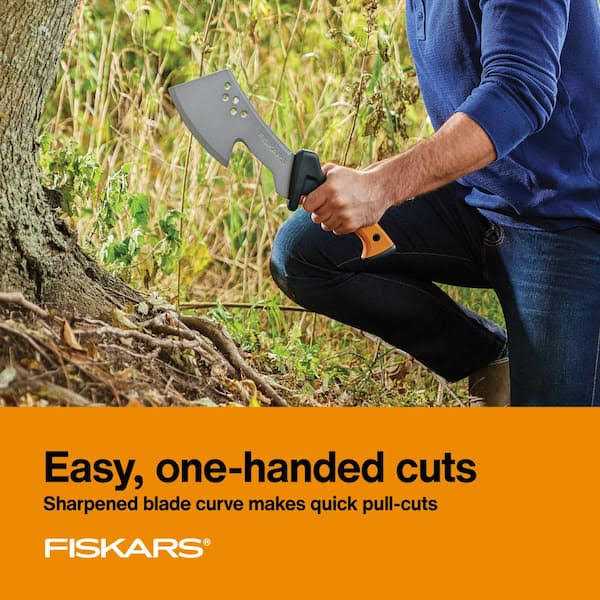 Take on tough yard and garden tasks quickly and easily with this heavy-duty Fiskars Hatchet. Perfect for chopping roots, vines, small branches, palms and more, the ultra-sharp, rust-resistant blade is thoughtfully designed to make quick work of heavy vegetation. The comfortable, ergonomic handle provides three grip possibilities for maximum control and power while the intelligent texture pattern helps you avoid blisters. With a sharpened blade curve for easy pull-cuts, a lifetime warranty, and a nylon carrying sheath, this hatchet has everything you need for fast, efficient chopping.The 9″ hatchet-like blade is made of hardened steel for long-lasting sharpness and is coated with a low-friction material that gets through tough materials without sticking. With its contoured Softgrip handle, you can pinch closer to the blade for precision or grip the middle for general use, letting one hand stay free to grab and pile cuttings. Additionally, the handle flare keeps the tool firmly in your hand when swinging with maximum force, while the finger guard provides extra protection for safe use.Whether you’re clearing your garden or taking on larger projects, the Fiskars Hatchet is the perfect tool to get more done quickly. With its versatile design and powerful performance, you can count on it to provide the easy, reliable chopping you need.