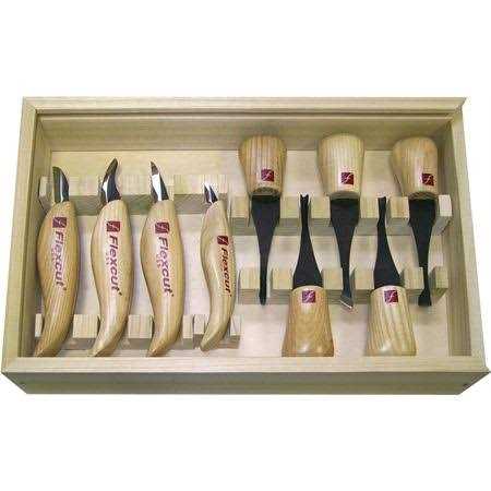 The Deluxe Palm & Knife Set brings together two popular tool sets to give carvers a wide range of capabilities in one economical package. The set includes four razor-sharp carving knives – a cutting knife, pelican knife, detail knife, and mini-detail knife. There are five palm tools including a skew, V-tool, and three gouges in 1/8, 5/16, and 3/8-inch sizes. The set is packaged in a wooden box for convenient and safe storage in any work area. Get $5 Cash Back for every $50 you spend on Flexcut products! offer expires July 31, 2017. Download rebate form.