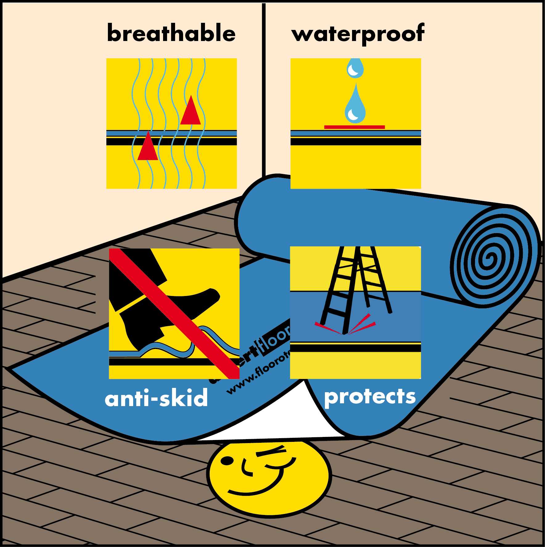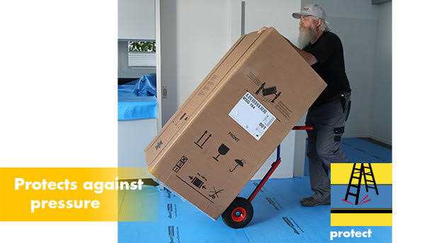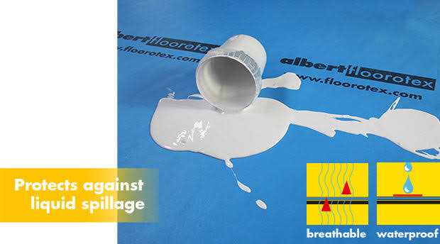 This ultimate construction floor protection is breathable, water proof, durable, and has a residue free anti-slip backing. This thick, light-weight hardwood floor protector has an ultra-light skid and slip-proof adhesive bottom that will not leave a residue on floors. Shield your work area from dirt, moisture and liquids with this protective floor covering product. This waterproof floor cover is reusable, just roll it up and store it until you need it again. The durable construction floor protection is also pressure and scratch resistant, and is virtually tear proof. There are two roll sizes available: 40 inches x 84 feet, and the larger roll size of 40 inches wide by 168 feet long. Floorotex All Purpose Breathable hardwood floor protector allows vapor transmissions for site finished floors. Use All Purpose protective floor covering on hardwood, ceramic, laminate, parquet, as well as other types of flooring. Do not use on newly laid porous stone floors or earthenware slab. Sections of this breathable floor covering can be seamed together with our breathable floor protection tape.